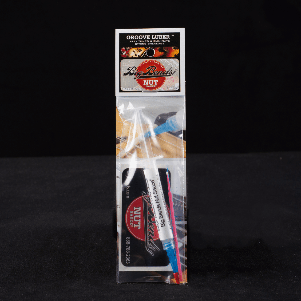 Used by Professionals the world over. Nut Sauce® is the Guitar Techs and Players secret to staying in tune and ending string breakage! Nut Sauce is a cutting-edge lubricant that is applied to the nut, bridge, string guides and pivot points of the bridge. It is clean and safe, will not run or drip, and is non-staining. Nut Sauce is entirely synthetic and contains no petroleum products. Nut Sauce has the lowest co-efficiency of friction of any product of its kind in the world. That means nothing can keep you in-tune or reduce string breakage like Big Bends Nut Sauce! Nut Sauce unleashes a player’s talent by removing concerns about tuning and string breakage. Nut Sauce also stops wear and tear at the bridge and nut, increases sustain and harmonics, and improves overall playability of any stringed instrument. Don’t be fooled by knock-off imitations.