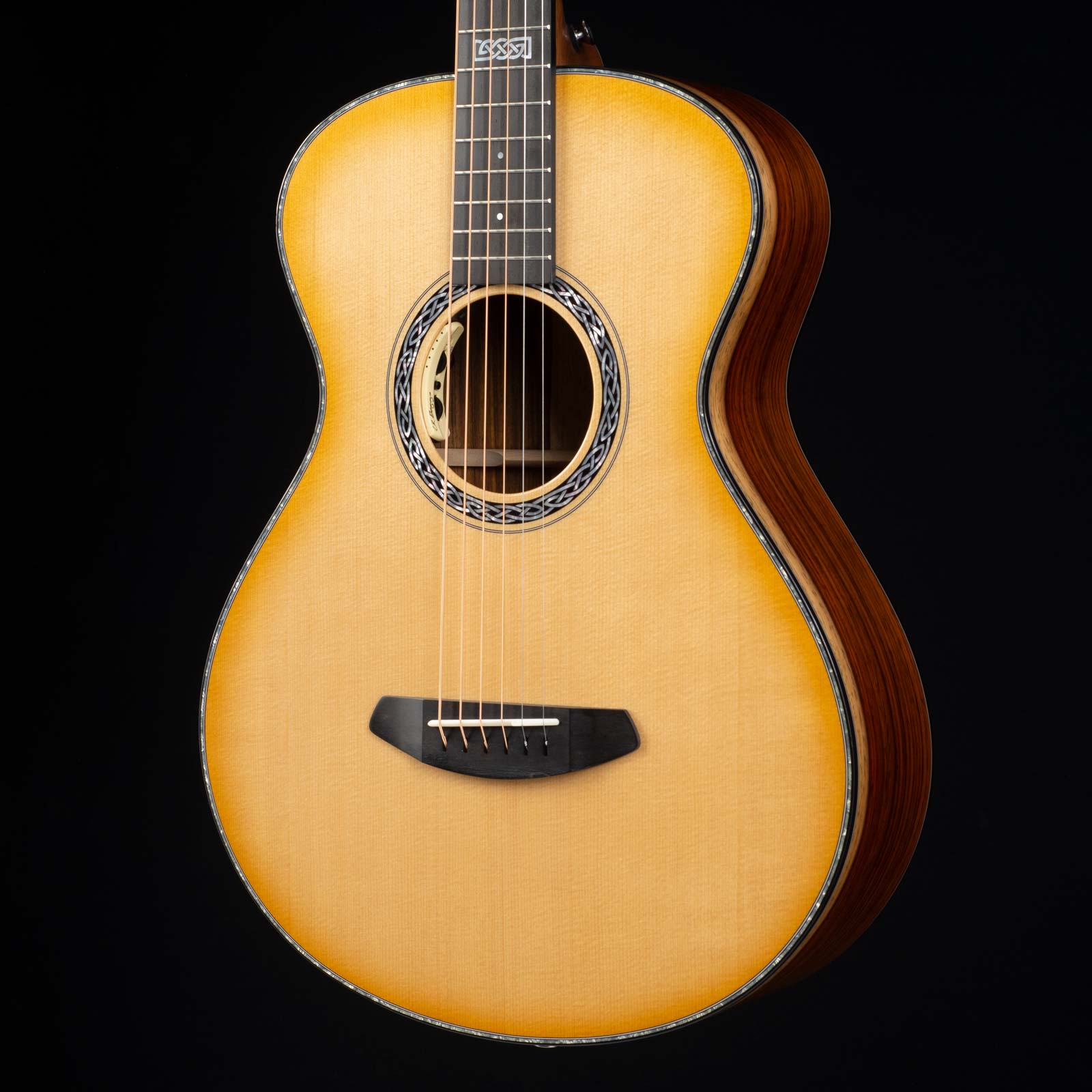 This Legacy Concertina E is crafted in Bend, OR, USA, with the kind of attention to detail you feel the second you pick it up. Honduran mahogany neck, ebony fingerboard and Delta bridge, clean black binding, and a Natural Shadow gloss top that sets off the cocobolo beautifully.