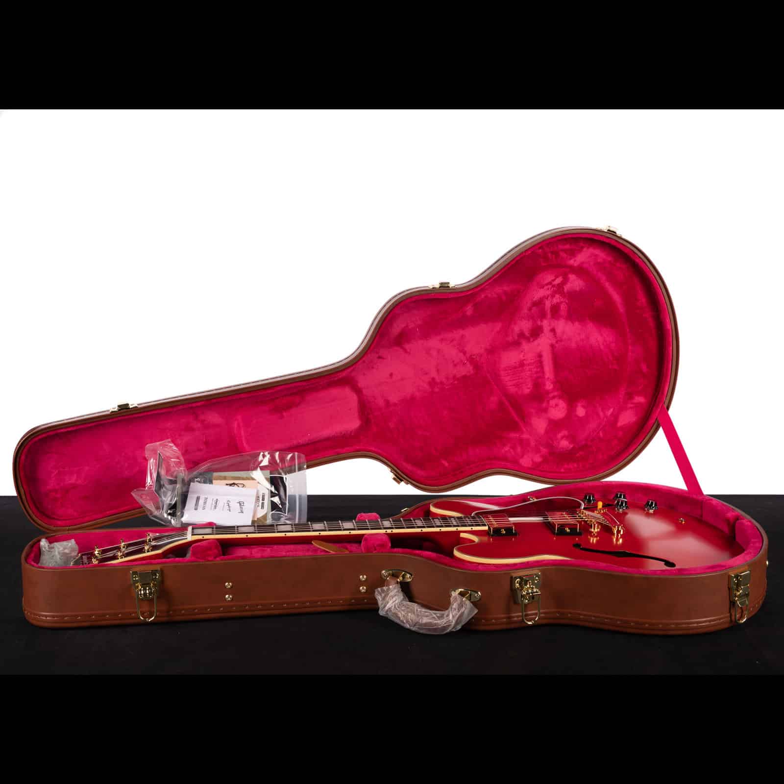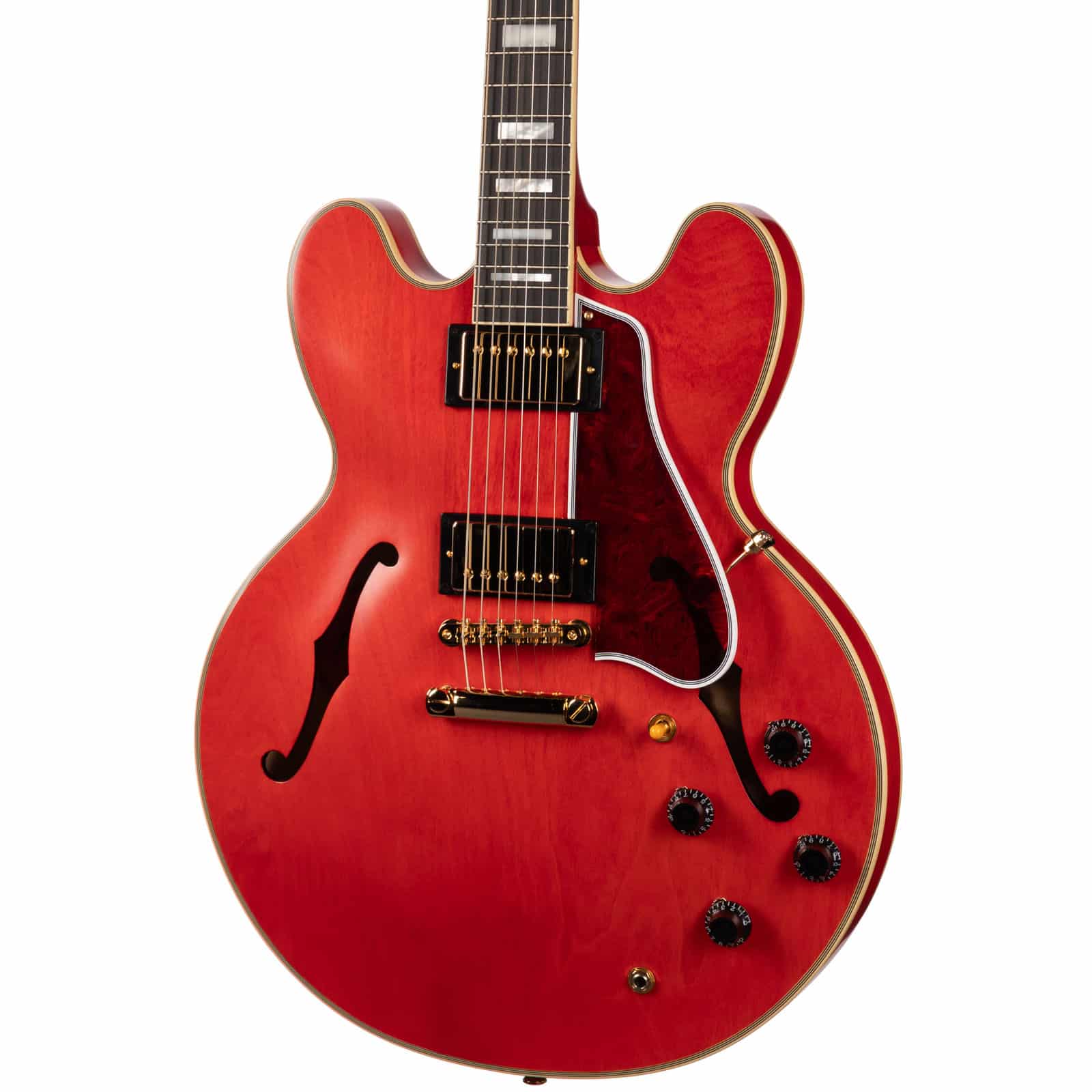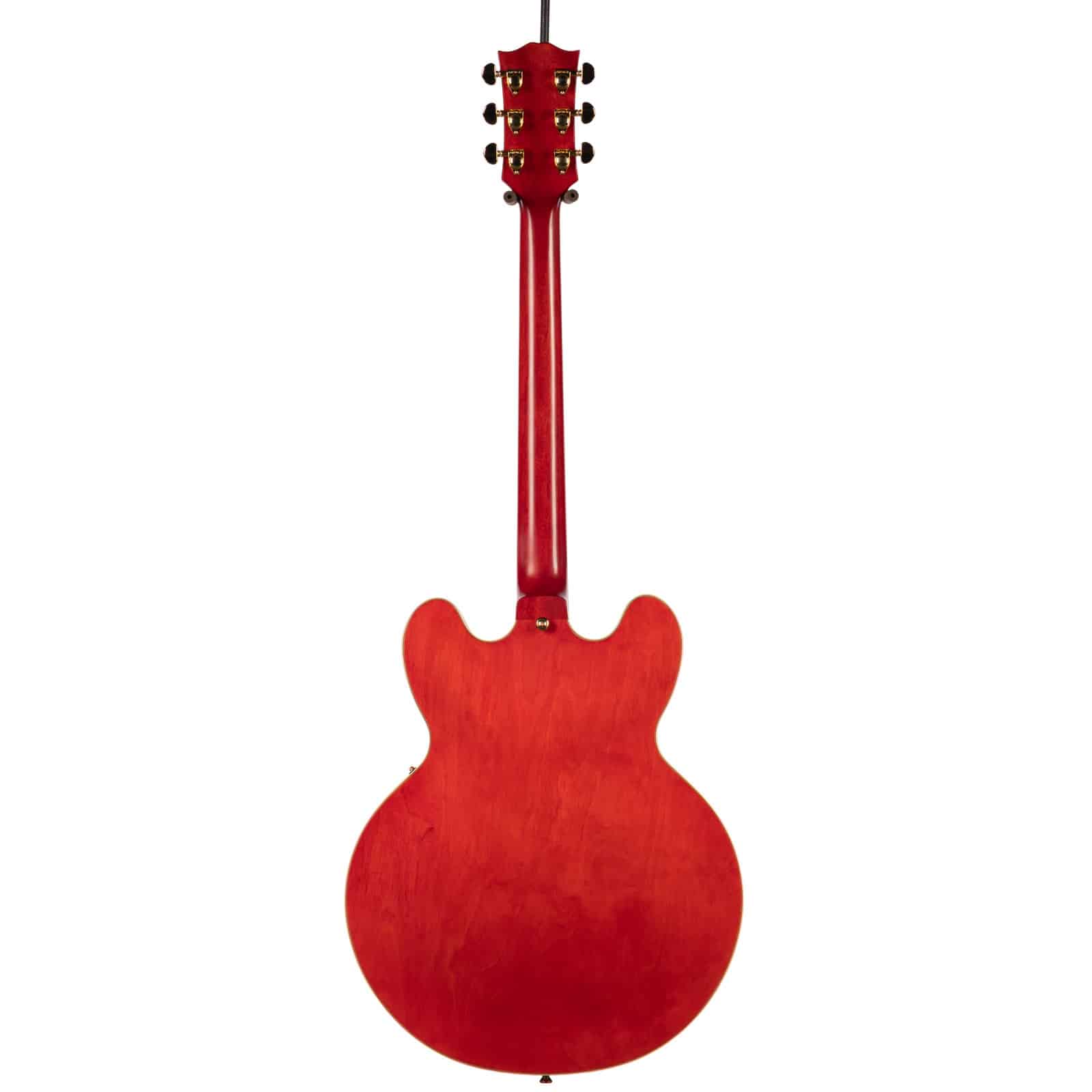 The 5-ply layered maple/poplar body with a solid maple centerblock and spruce bracing gives you that perfect mix of air and focus. It rings like a semi-hollow should, but the centerblock keeps the feedback under control when you lean on your amp or stack some drive pedals. The VOS cherry red poly finish has that gently aged sheen that looks classy under stage lights instead of plasticky and cheap.