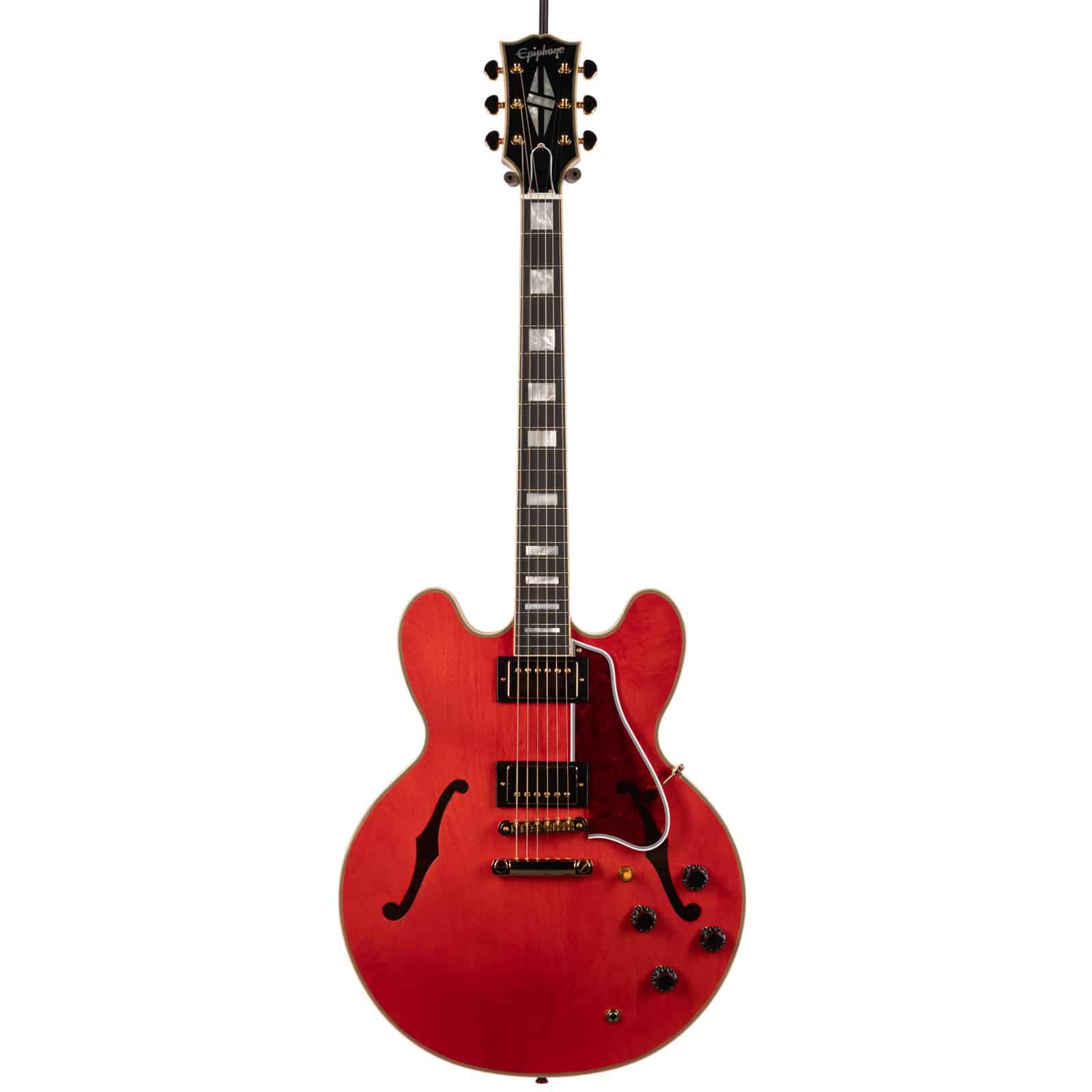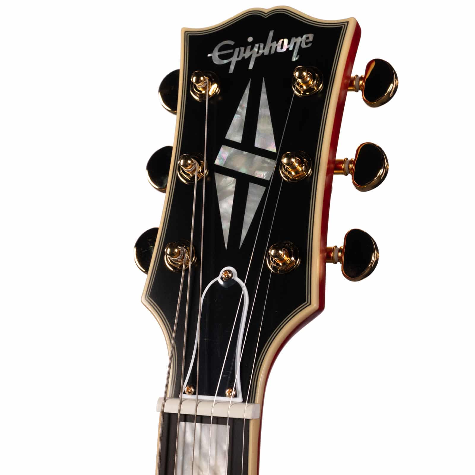 This is Epiphone’s top-of-the-line ES shape, and you feel it as soon as you pick it up. The ES-355 body brings full-size semi-hollow authority, dressed up with multi-ply binding, a long tortoise pickguard, and gold hardware that screams “big gig” before you even plug in.