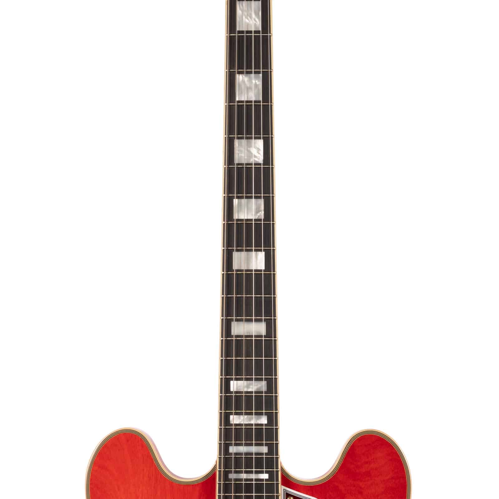 The ebony fingerboard brings snap and clarity to every note. A 12 inch radius and 22 medium jumbo frets mean bends are glassy and smooth, chords stay comfortable all over the neck, and the mother of pearl block inlays give you that old-school ES-355 tuxedo vibe every time you look down.