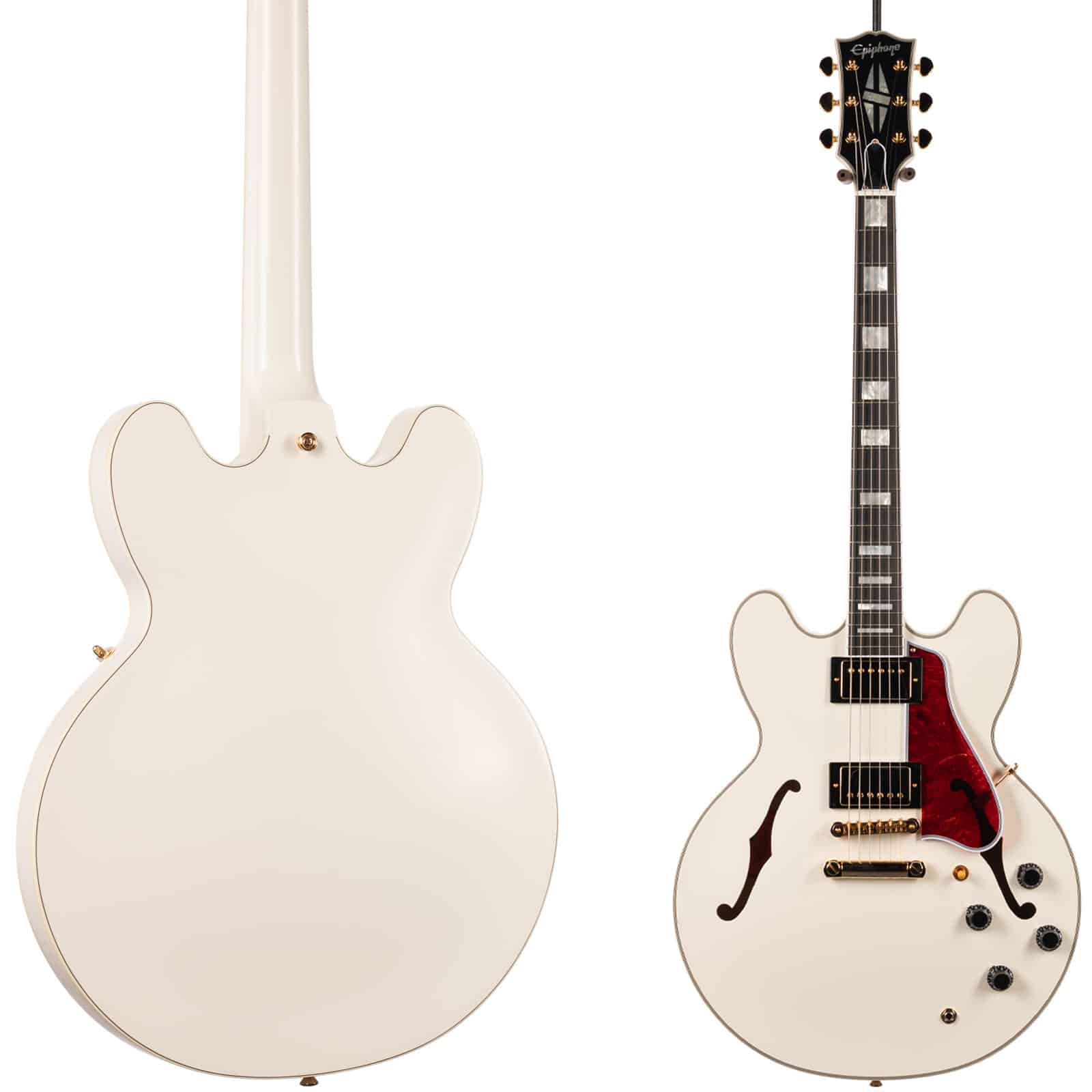 The Classic White finish, gold hardware, and tortoise bound guard hit that tuxedo-level class without feeling fragile or fussy. Gold Grover Rotomatic tuners, gold pickup covers, and the Gibson-style open book headstock with split diamond inlay make this look like it should cost two or three times what it actually does.