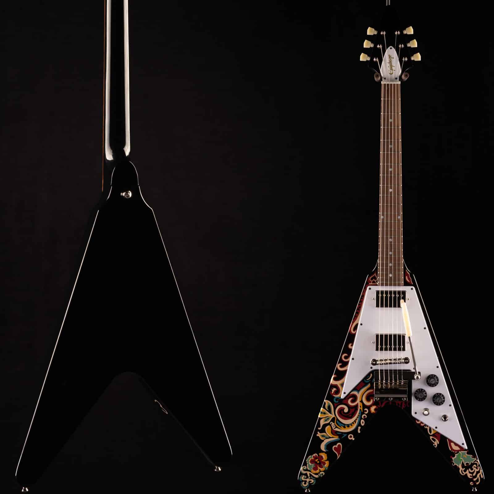 This is an Inspired by Gibson Custom recreation of the Hendrix Love Drops V, right down to the ebony refinish and those hand painted style psychedelic graphics. It feels more like a piece of rock history than just another signature model, with Jimi’s reproduced signature and Inspired by Gibson Custom logo on the back of the 1967 style headstock.