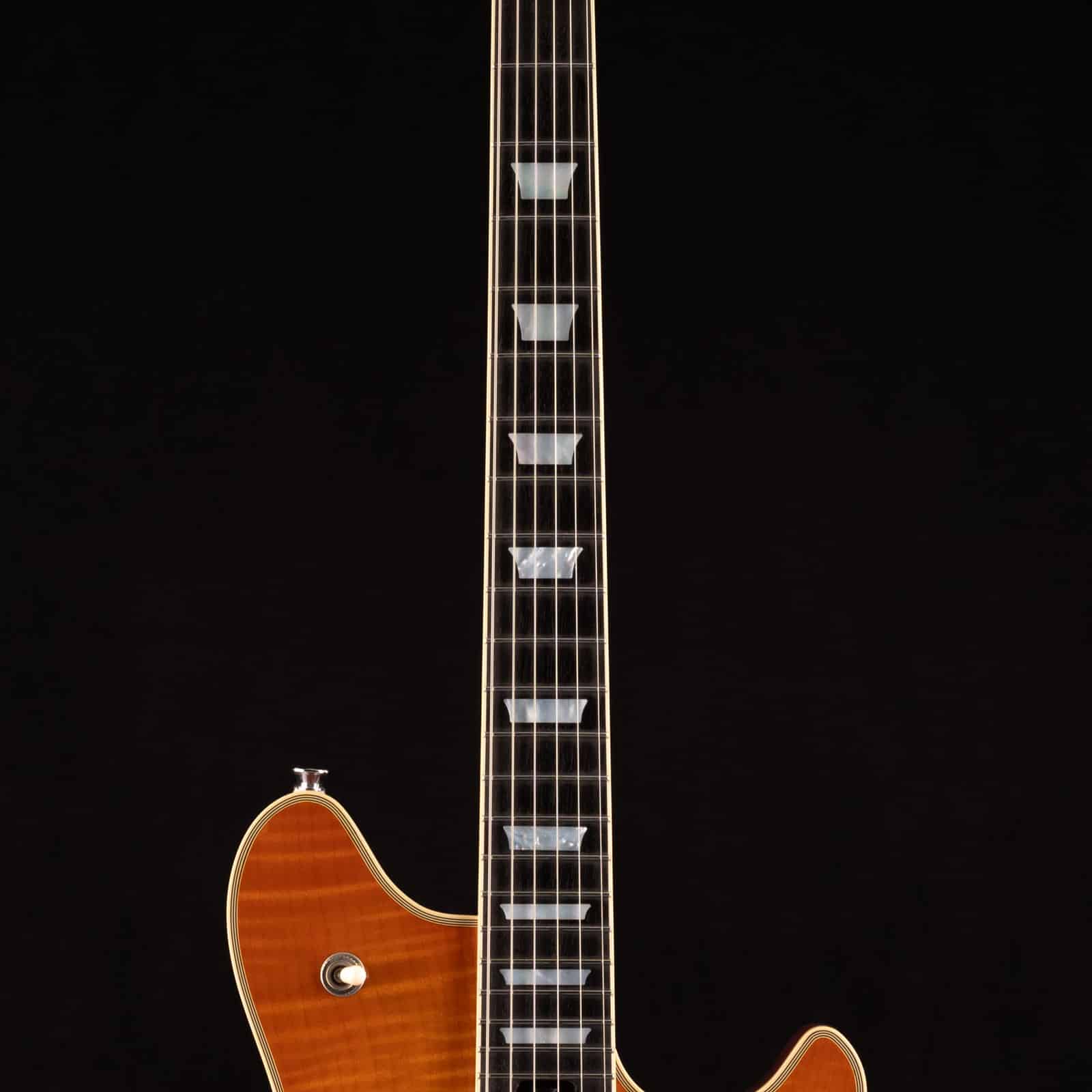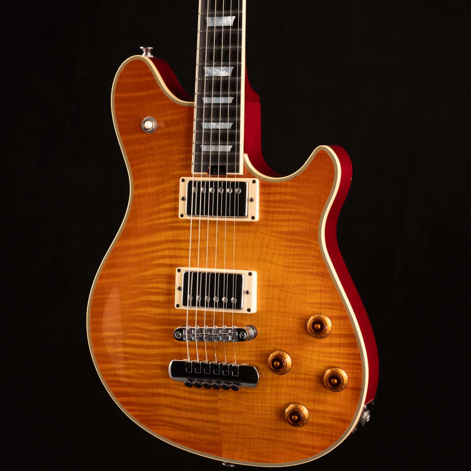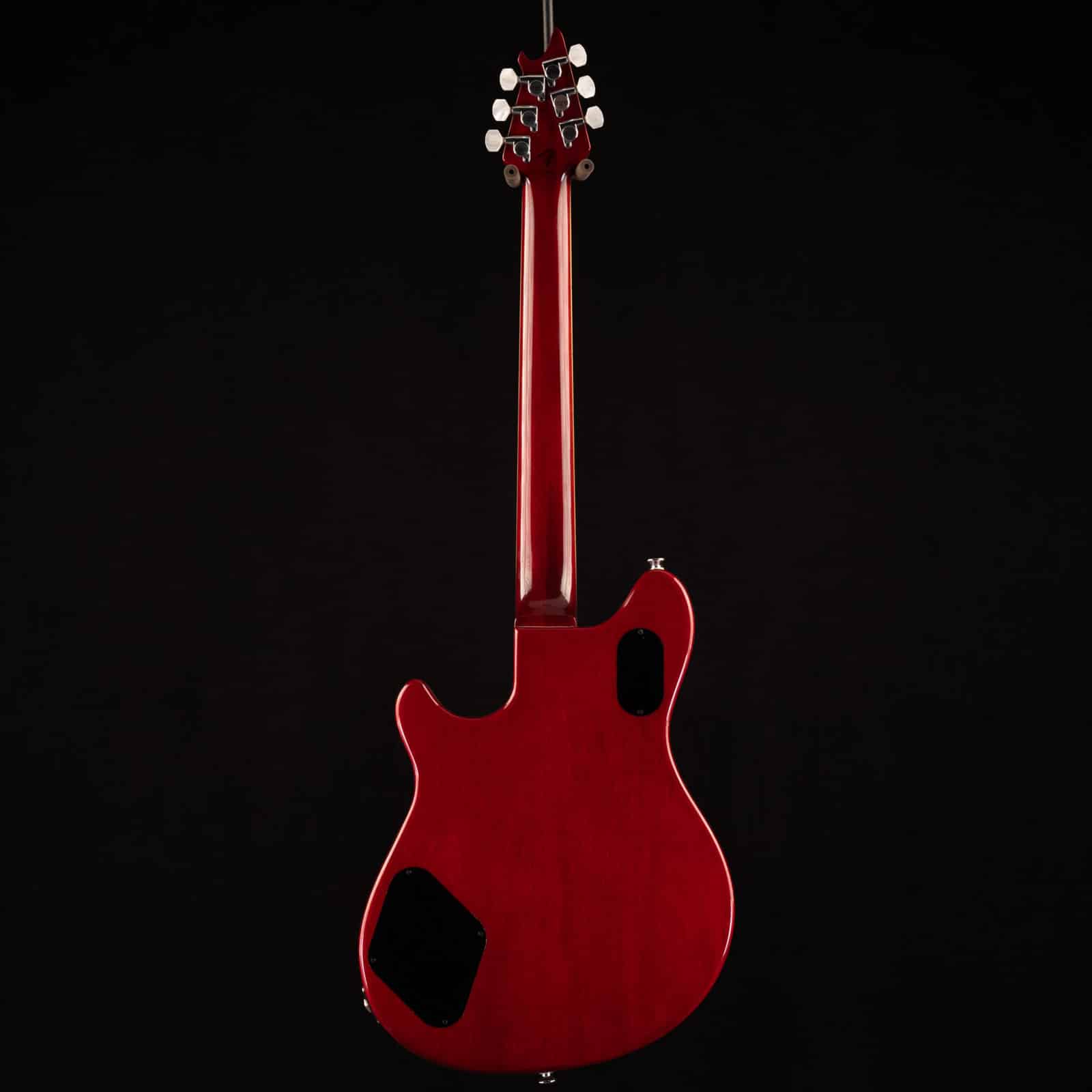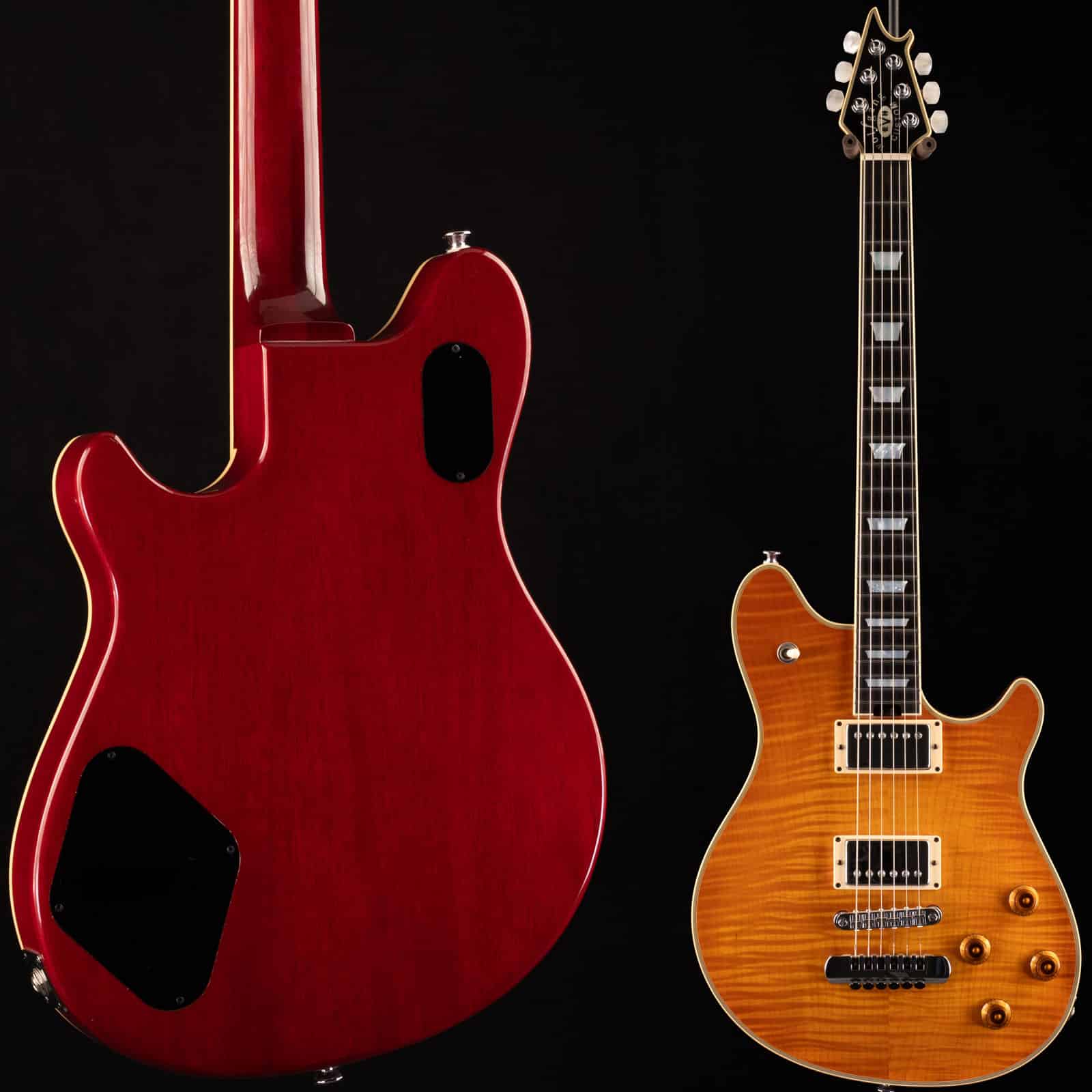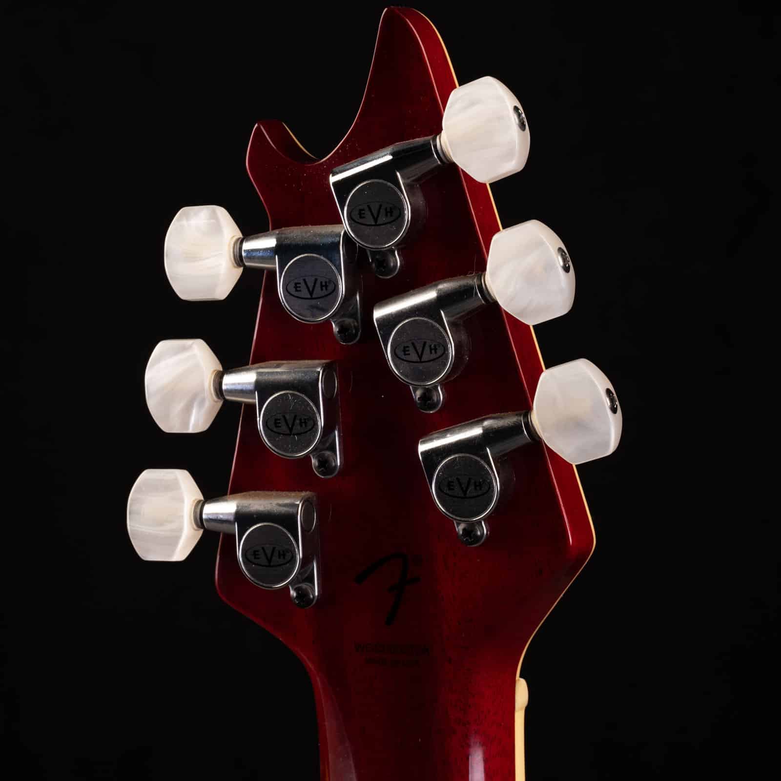 The highly distinctive U.S.-built Wolfgang Custom has an all-mahogany body with solid flame maple top, vintage set-neck design and 24.75” scale length. The mahogany neck has graphite stabilizing rods, wheel-style double-action truss rod adjustment at the base of the neck, and a 22-fret ebony fingerboard with stainless steel frets and trapezoid block inlays. Features include seven-ply binding (body, back and headstock), Wolfgang pickups with chrome covers, three-way pickup toggle switch in classic body position, two EVH high-friction tone knobs and two low-friction volume knobs, hard-tail bridge with fine tuners, and EVH tuners with new look.