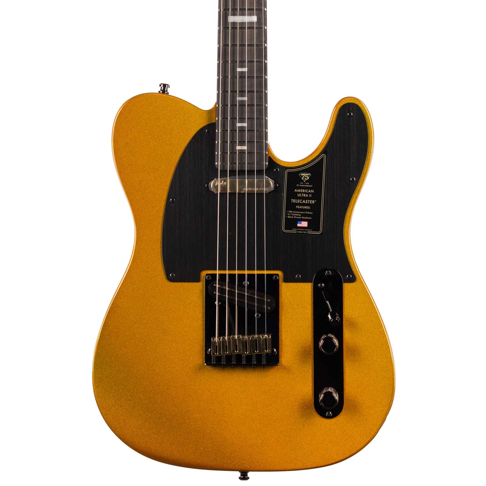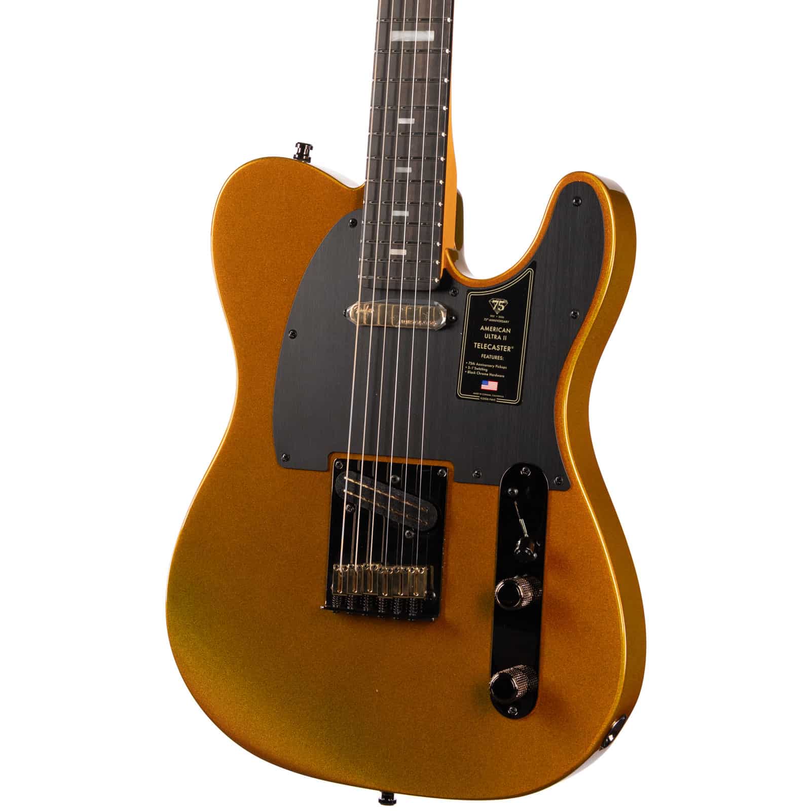 Celebrating three-quarters of a century of game-changing tone and design, the Fender 75th Anniversary American Ultra II Telecaster is more than just an instrument—it’s a piece of history, refined for the modern player. Dressed in a mesmerizing Liquid Gold finish, this Tele demands attention before you even play a note. The deep metallic flake dances under the lights, creating a visual experience as rich and complex as its tone. This isn’t just a guitar; it’s a statement.