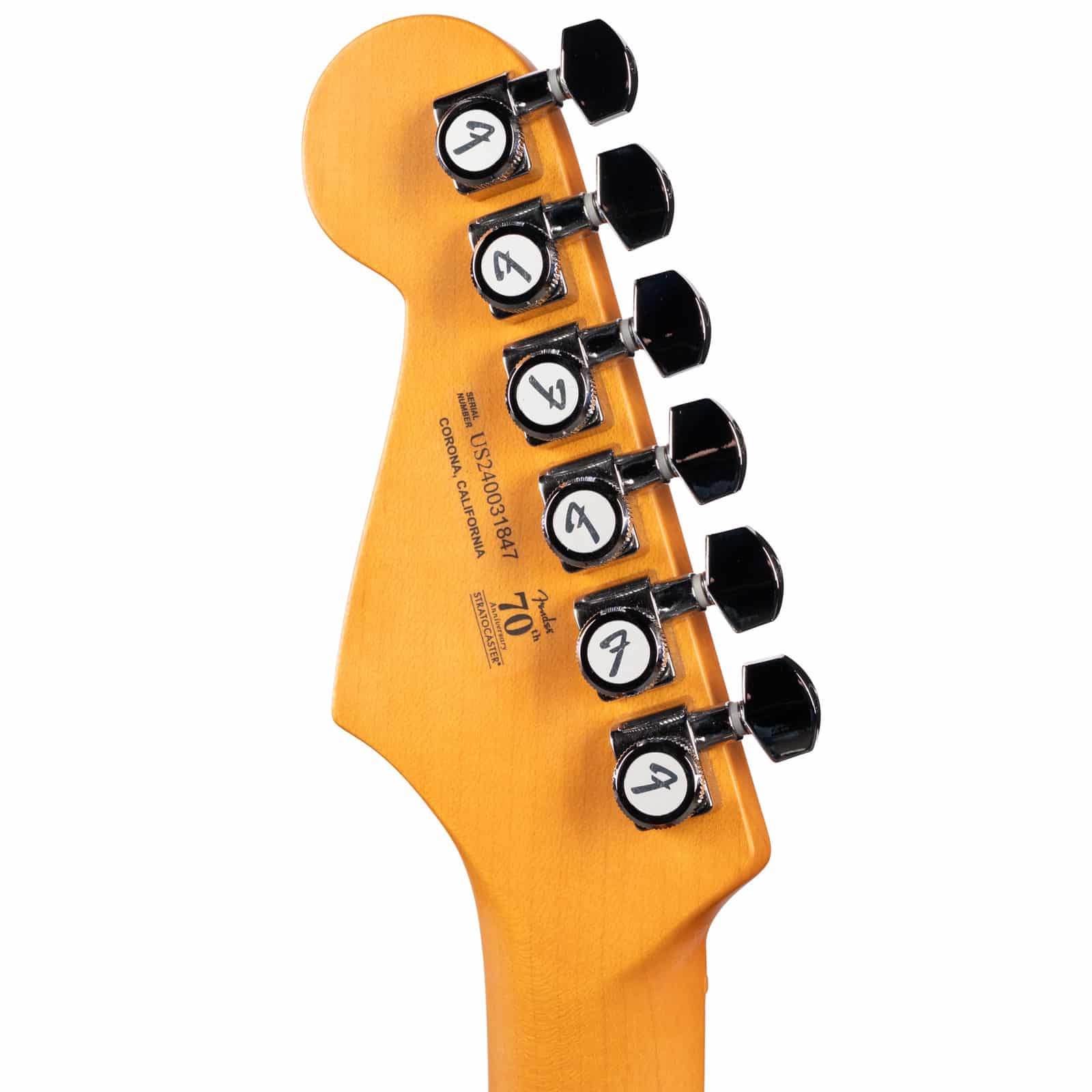 The appointments on this guitar are all pro-grade. The 2-Point American Ultra Synchronized Tremolo features a cold-rolled steel block for massive sustain and polished stainless steel saddles for a smooth feel. Combined with the pop-in tremolo arm, it provides stable, expressive vibrato. Up top, the Deluxe Cast/Sealed Locking tuners and a Graph Tech TUSQ nut ensure rock-solid tuning stability, even through heavy trem use and aggressive playing. This guitar is built to perform, night after night.