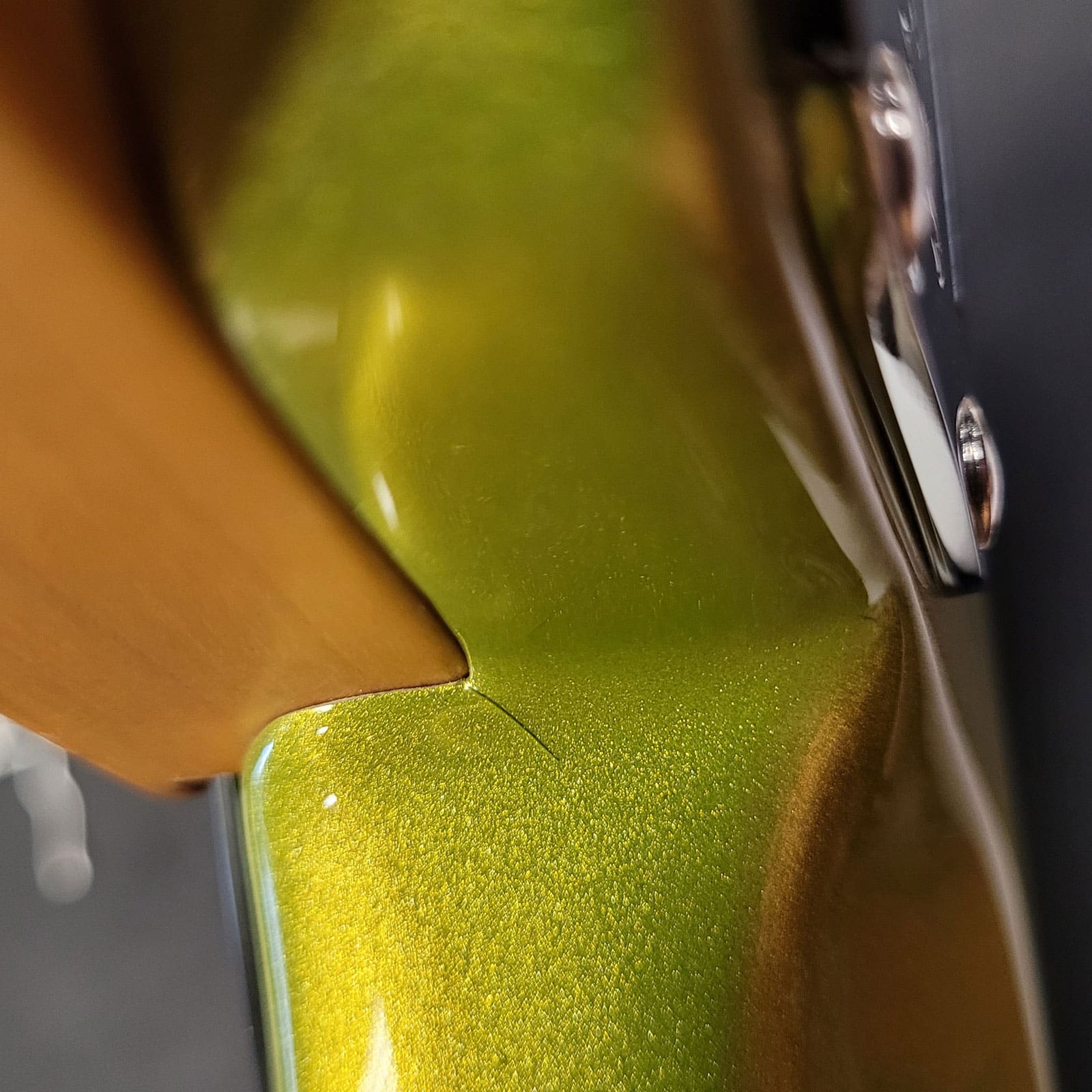 The 10 to 14 inch compound radius maple fingerboard with Ultra rolled edges is a big deal in real life. Down low it feels comfy and natural for chords, then it gradually flattens out up top so big bends stay glassy and clean without fretting out. Medium jumbo frets and the slick Ultra Satin finish make this neck feel fast, forgiving, and ready for long sessions.