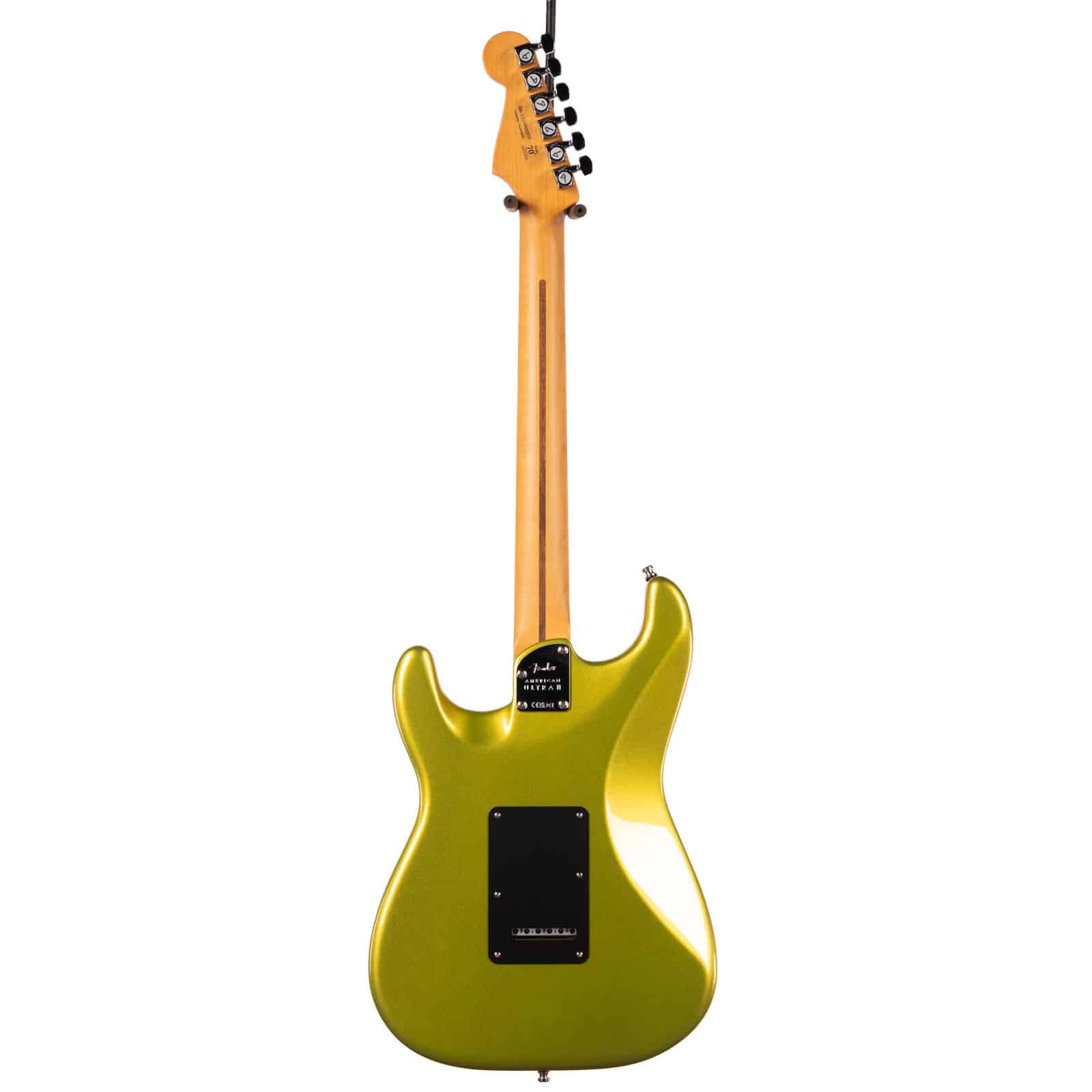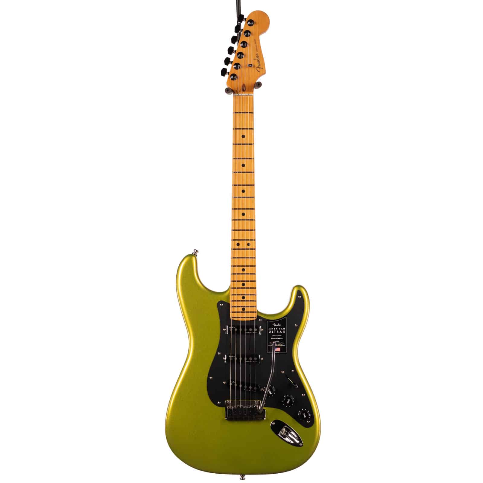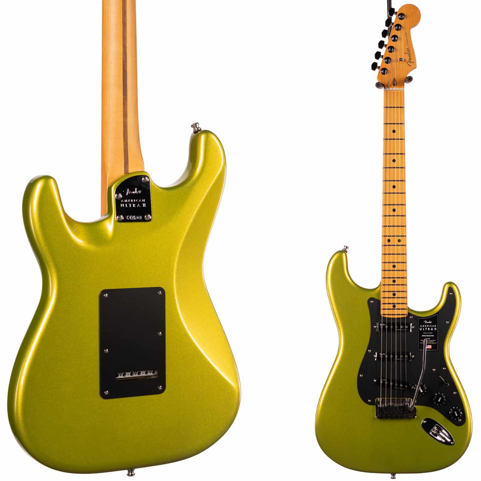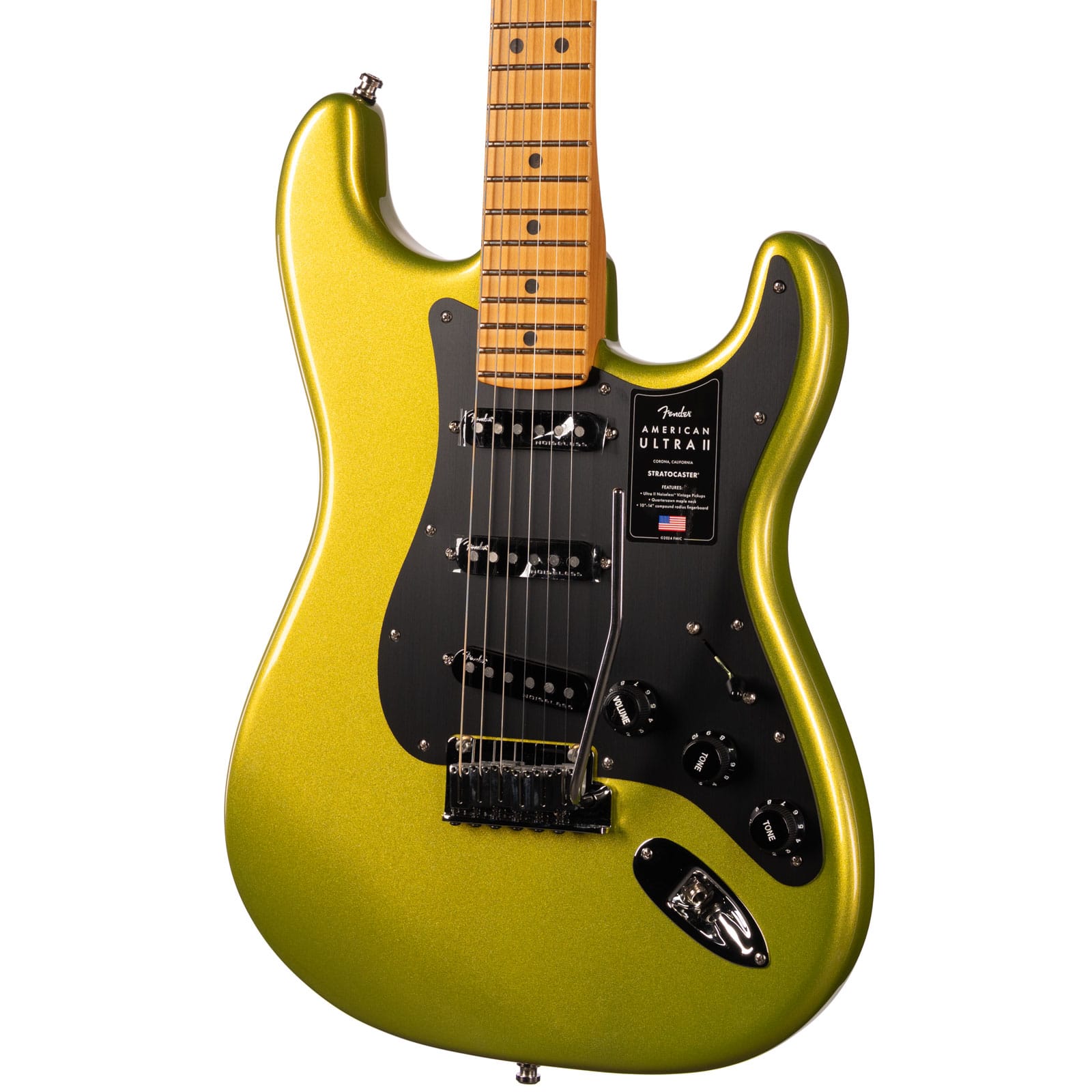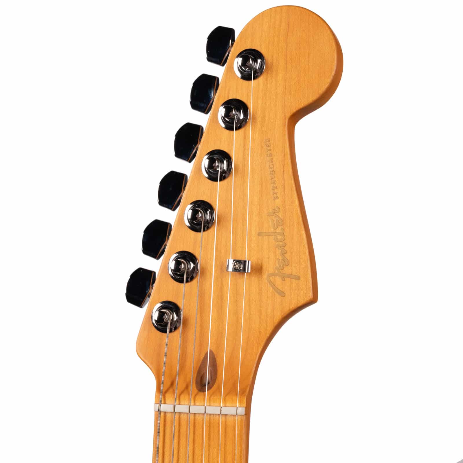 The 2-point American Ultra synchronized trem with polished stainless block saddles and a cold rolled steel block keeps feel smooth and tuning solid. Deluxe locking tuners, a Graph Tech TUSQ nut, pop-in trem arm, Ultra string guide, locking strap buttons, and a 1-ply black anodized aluminum pickguard round out a hardware package that is built for stages, not just bedroom jams.