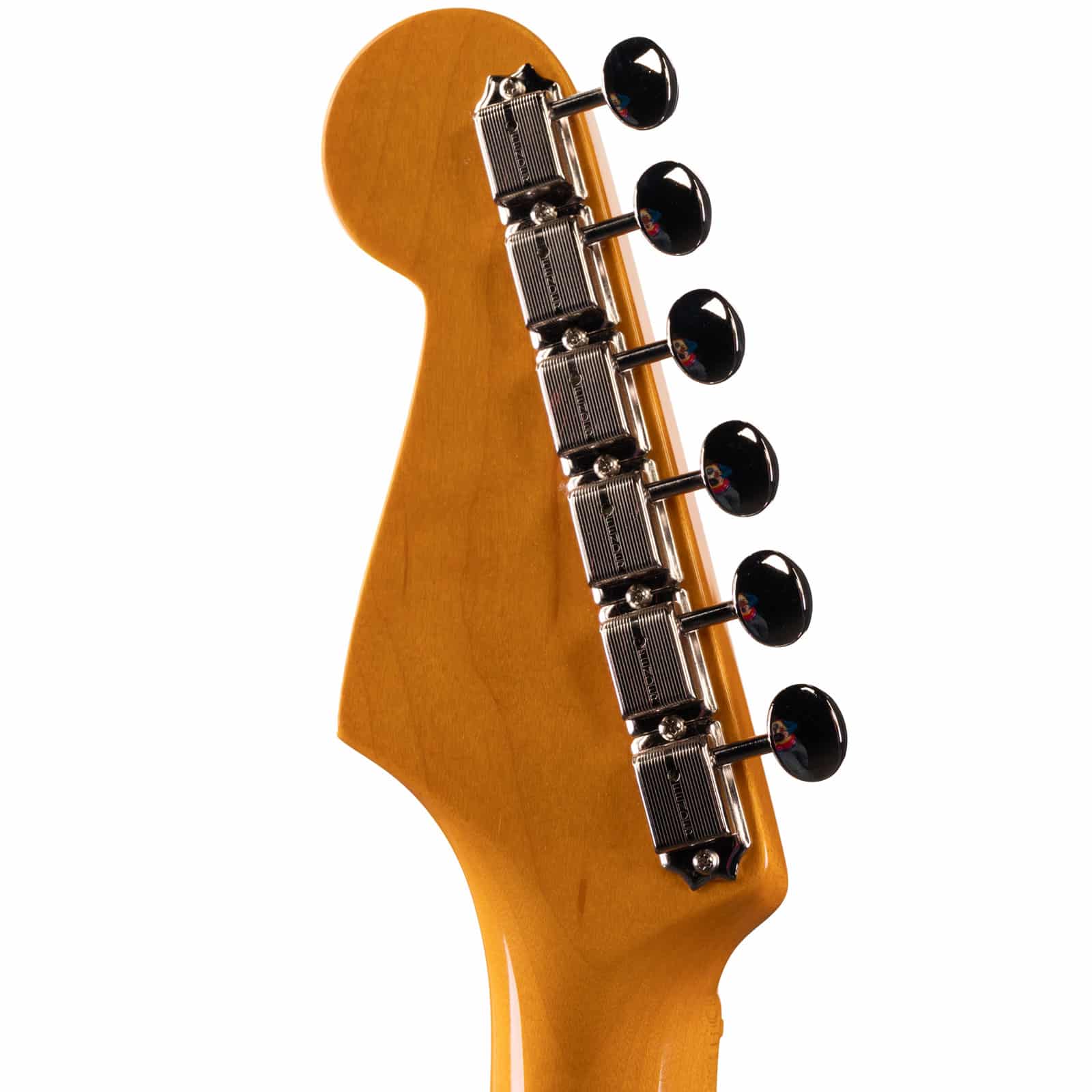 The 1 piece maple neck and 7.25 inch radius fingerboard keep it period correct, while the vintage tall frets make bends and vibrato feel easy and controlled. Gloss nitro on the neck starts slick, but it will break in over time into that smooth, played in feel we all love.