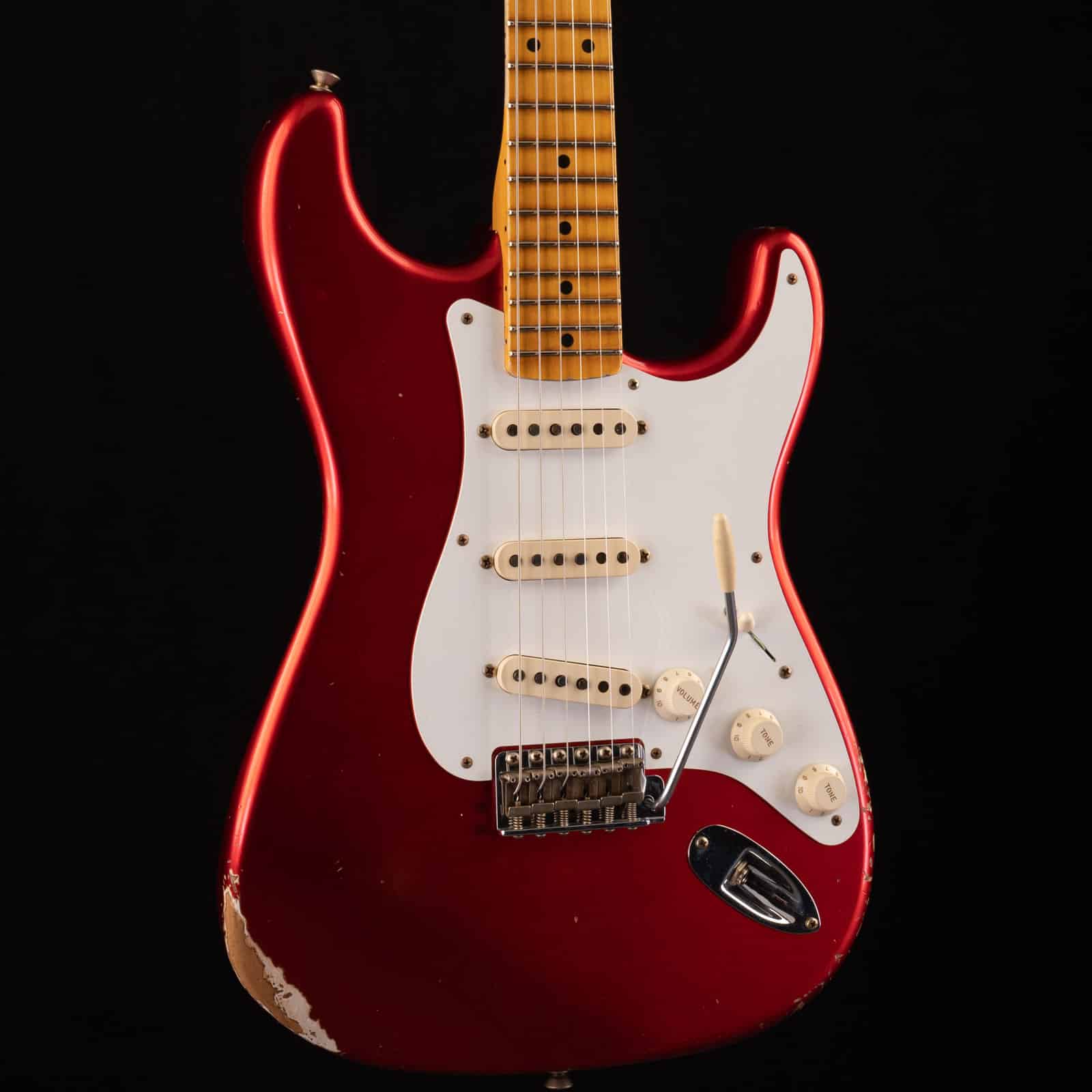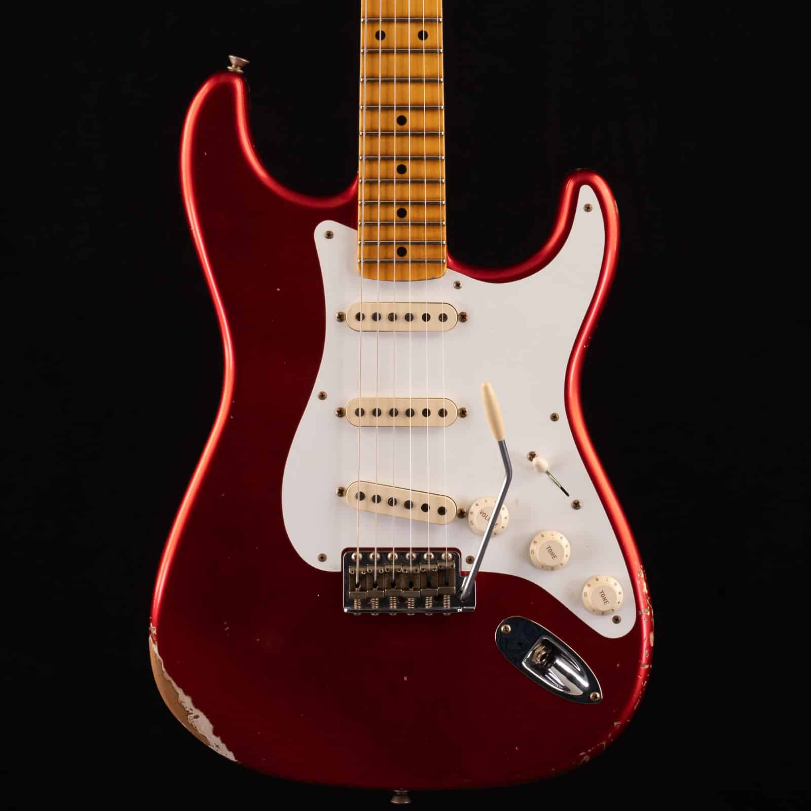 The alder body gives you that classic Strat recipe: tight low end, clear mids, and highs that cut without getting harsh. The Faded Aged Candy Apple Red relic nitro finish lets the body breathe and resonate in your hands instead of feeling choked under a thick poly coat.