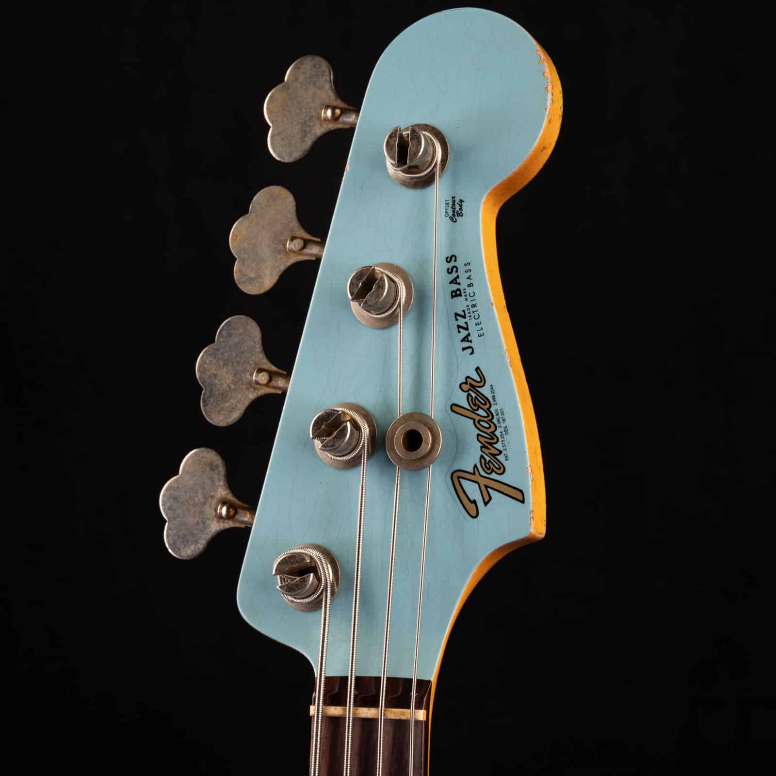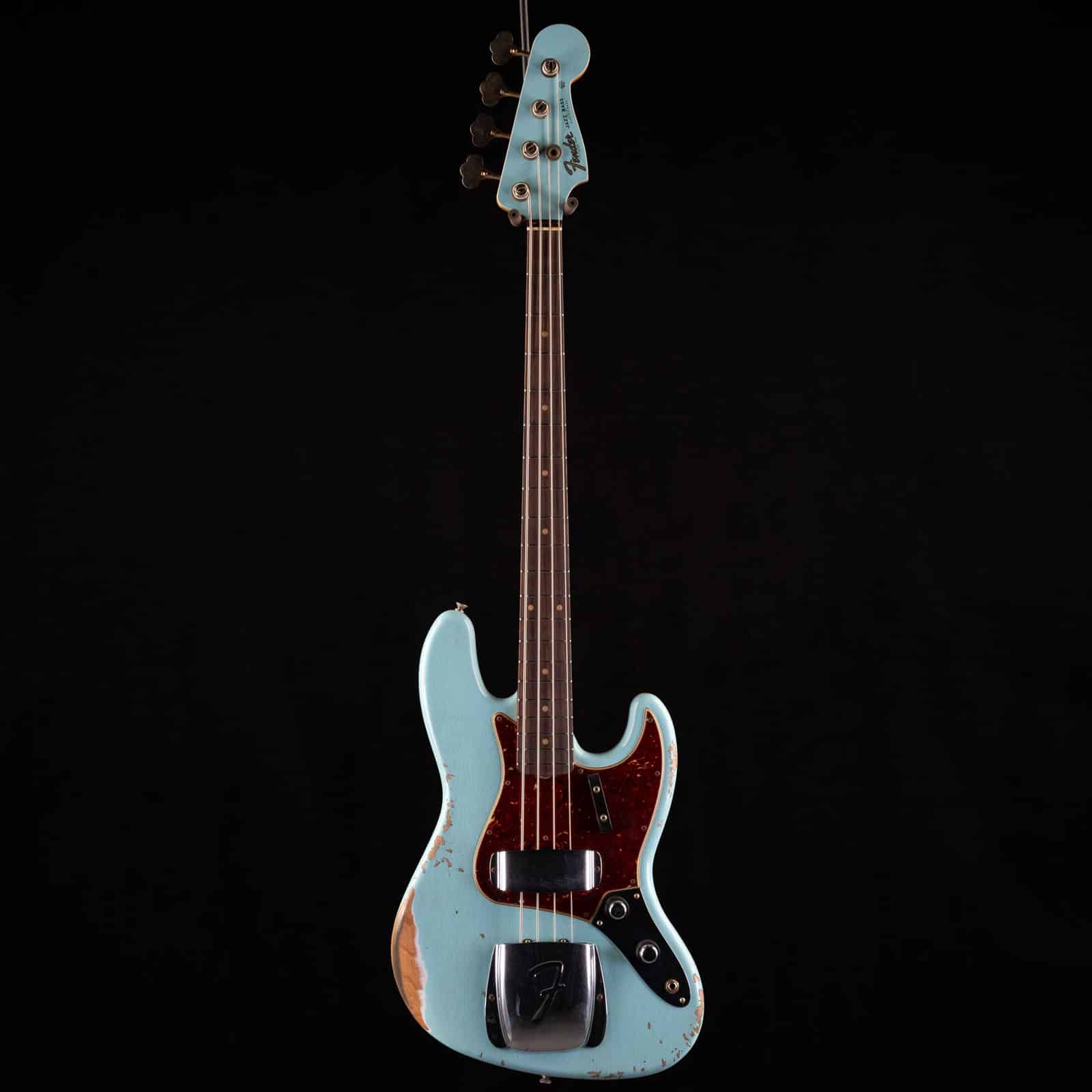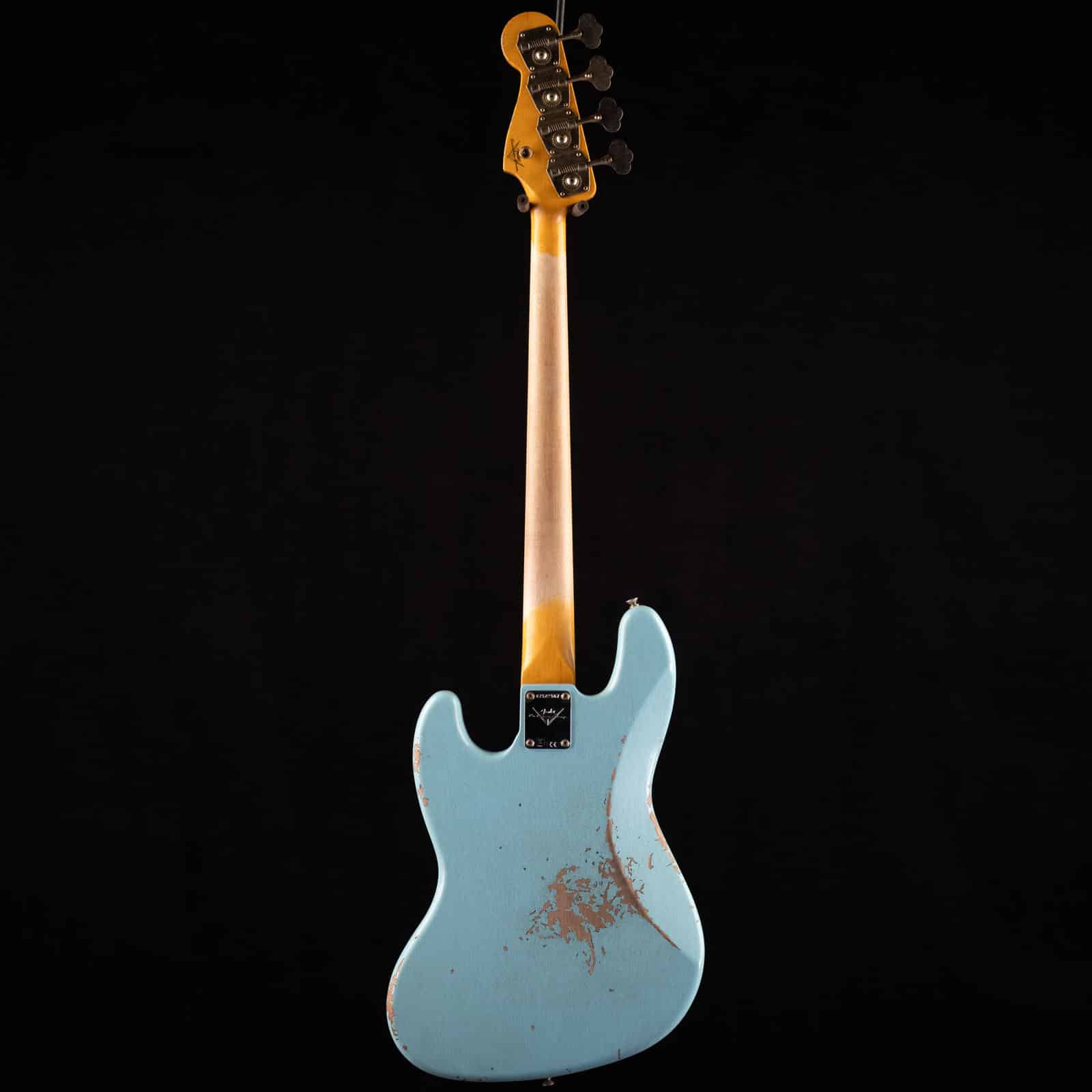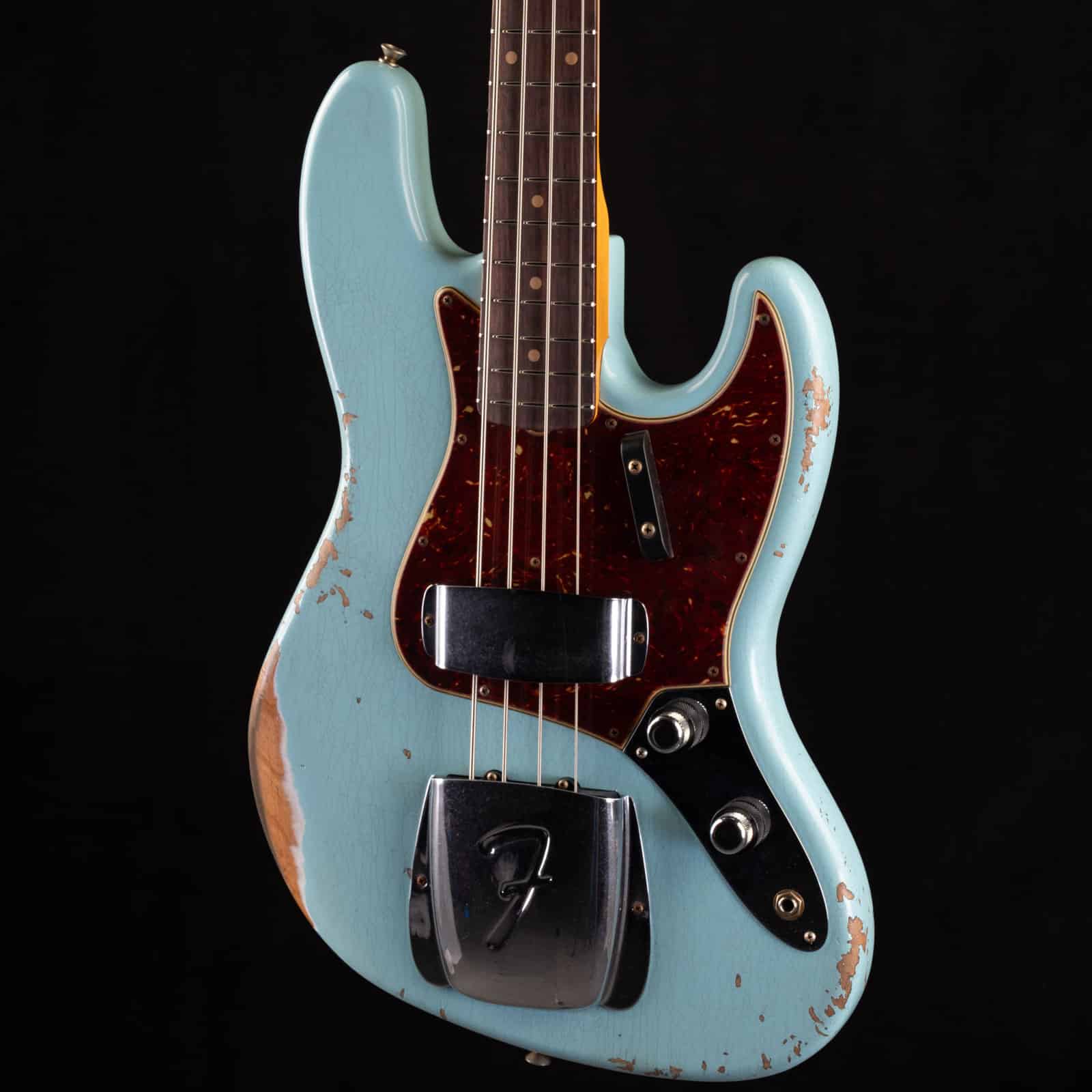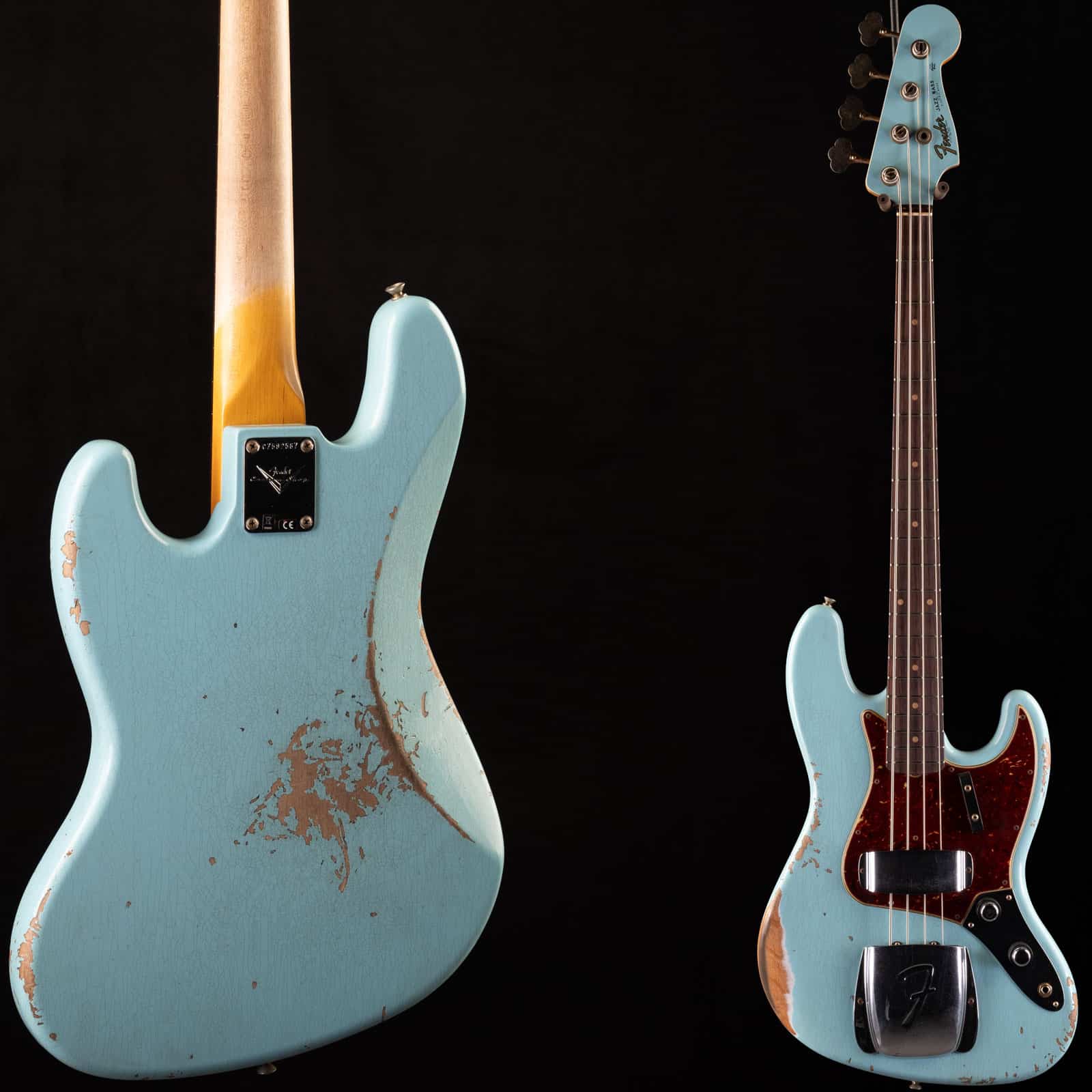 The P/J Bass bridge and vintage bass nickel relic tuners keep things rock solid while matching the worn in look of the rest of the instrument. The ’64 style 4 ply tortoiseshell pickguard completes the classic Jazz Bass silhouette and frames the Daphne Blue perfectly.