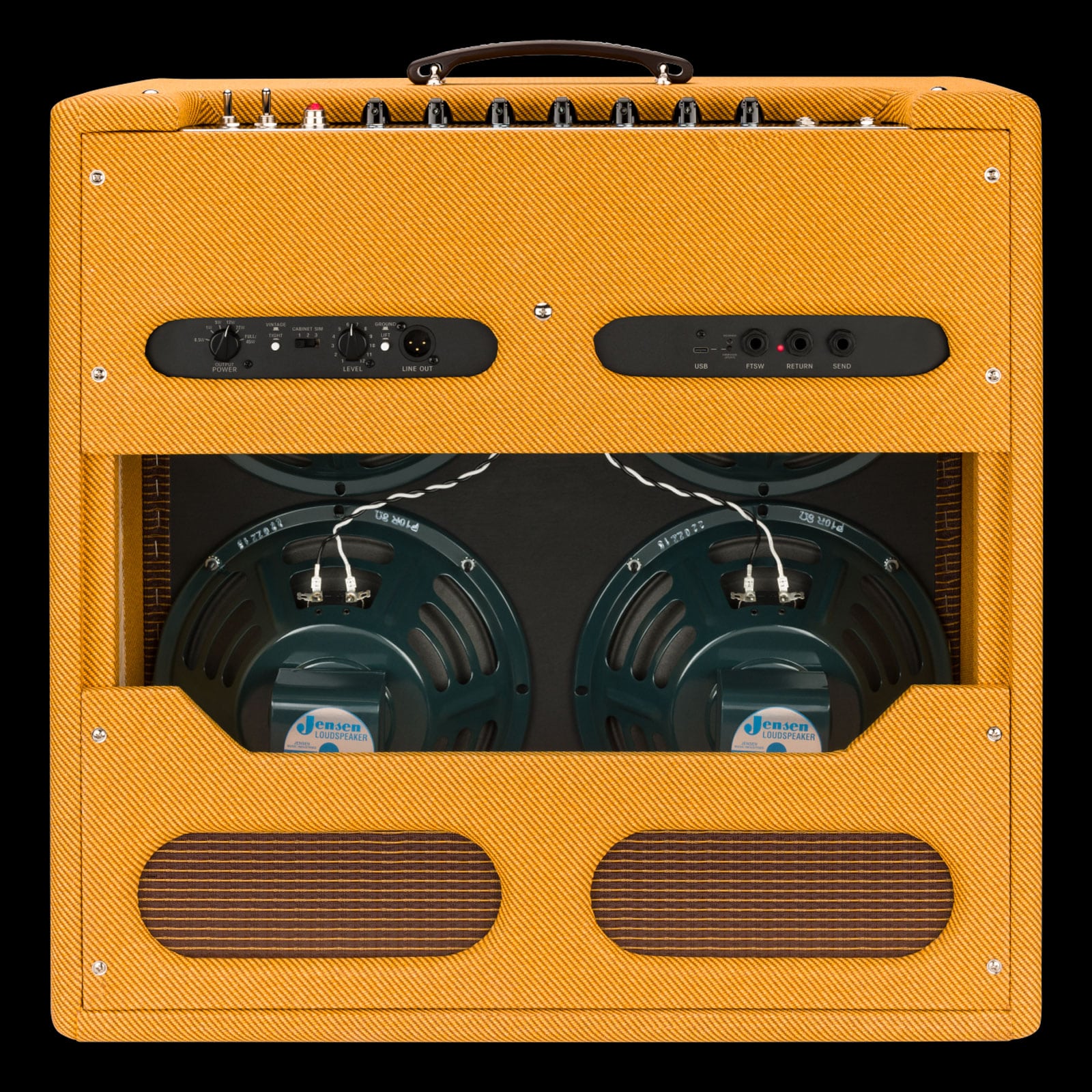This remarkable Fender technology is paired with the sparkle and touch sensitivity of four Jensen® P-10R speakers, as well as player-centric additions like convolution spring reverb, a vintage/tight switch for smoother bass response and a post-power amp effects loop. Other features include an output power selector for full power and five attenuated settings, impulse response (IR) XLR line output for detailed cabinet simulations, mute switch, and lightweight pine cabinet.