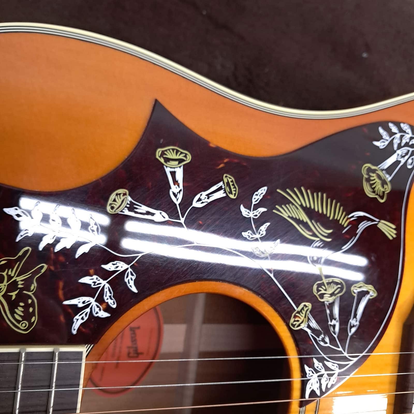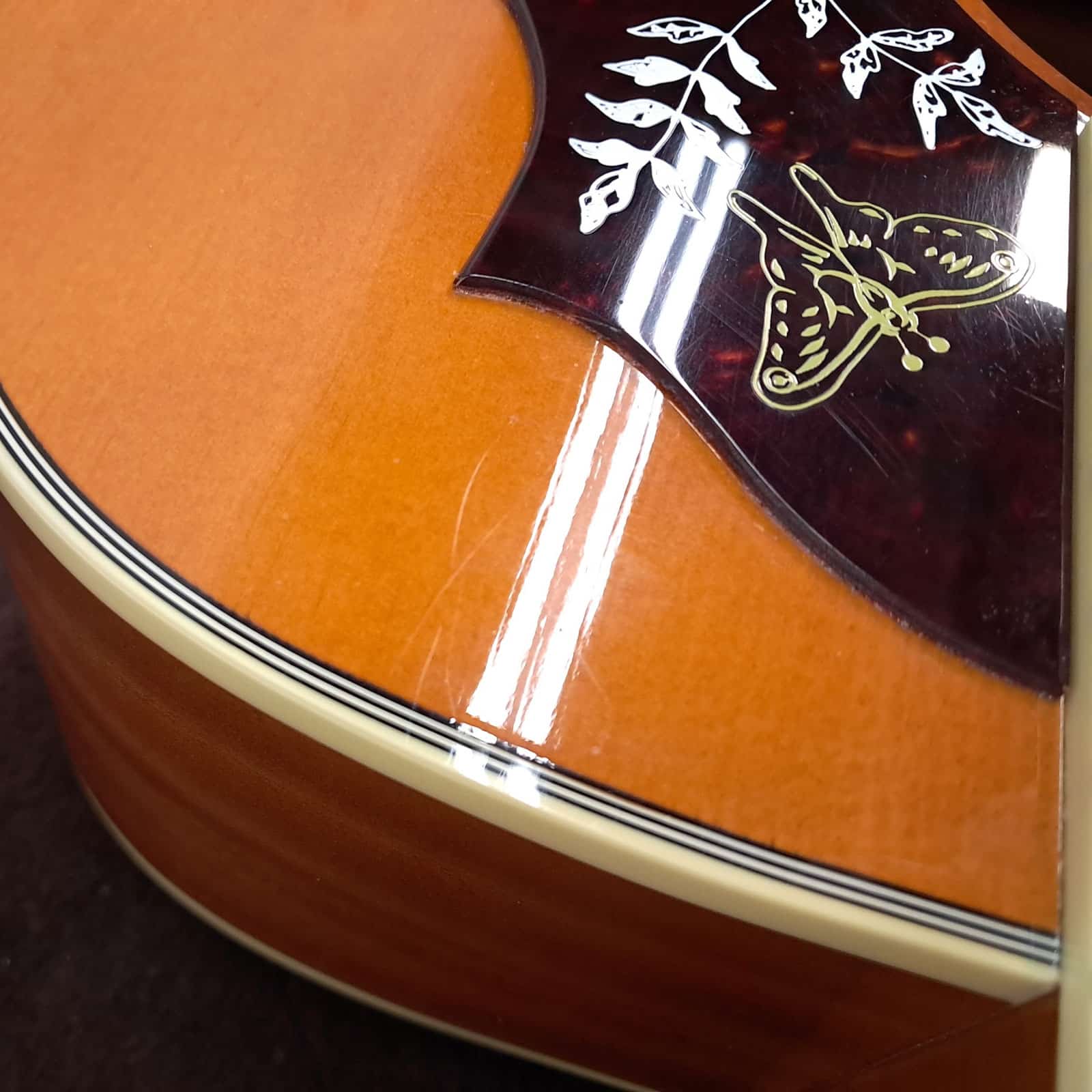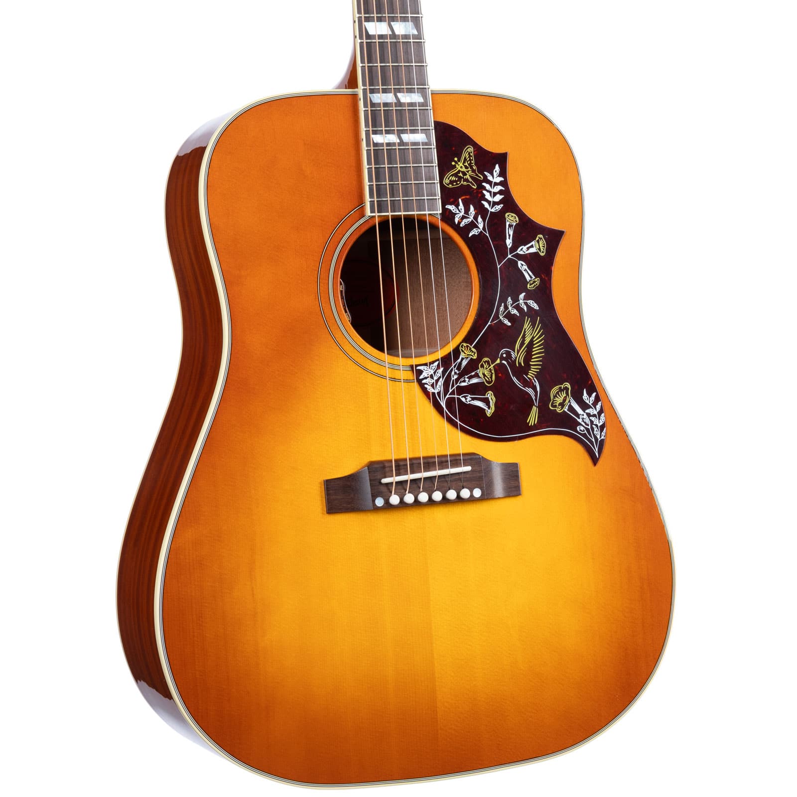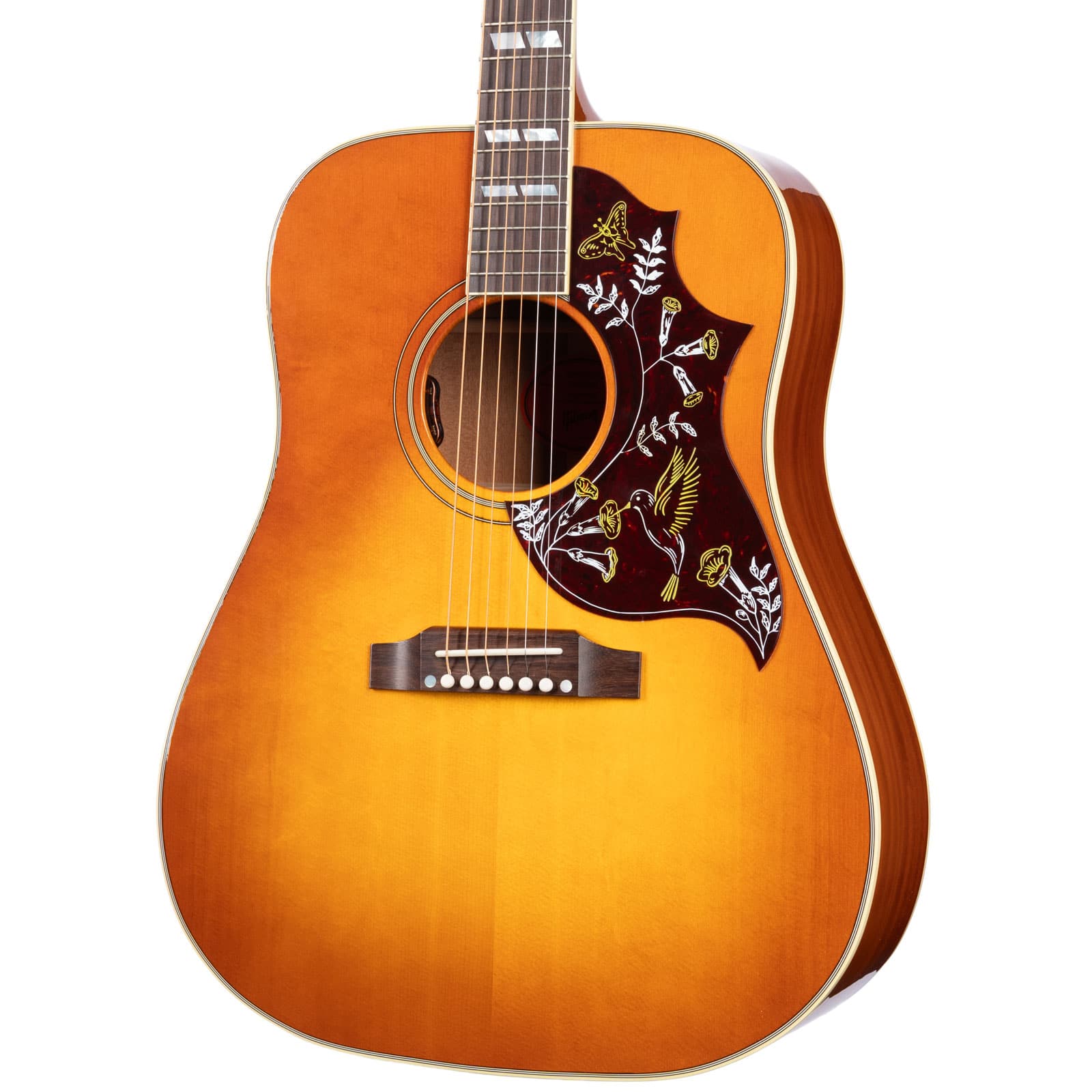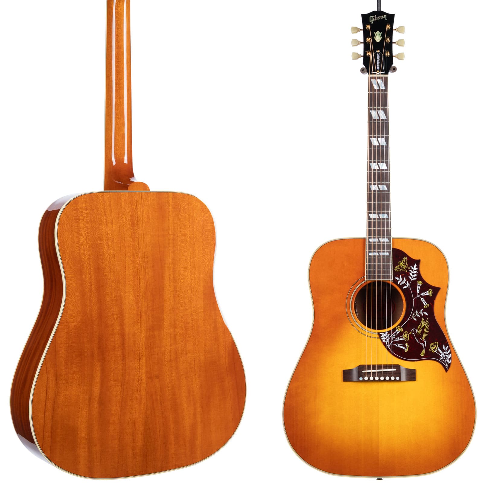 The Hummingbird’s voice is built on a foundation of classic, solid tonewoods. A Sitka spruce top provides the horsepower—giving you a tone that’s crisp, clear, and dynamically responsive to your attack. Paired with mahogany back and sides, the sound mellows into a warm, balanced voice with a rich midrange that’s perfect for sitting with a singer. The traditional hand-scalloped X-bracing lets the top breathe and resonate freely, creating a huge, open sound that fills the room whether you’re strumming hard or fingerpicking softly.