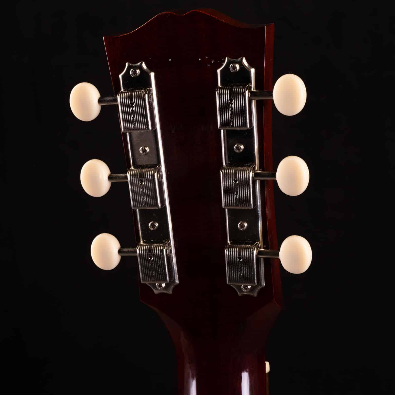 Gibson leaned hard into the golden era look here: 50s style tortoise pickguard, cream button Grover tuners, subtly aged binding, and nickel hardware. It looks like a seasoned lifer, not a shiny toy.
