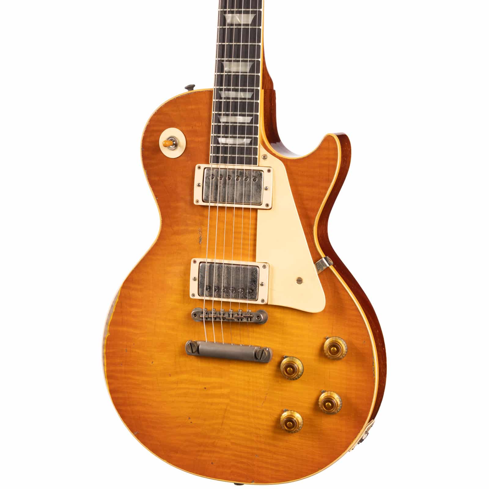 Real talk—not all vintage ‘Bursts were perfectly bookmatched. This ’59 leans into that history with a “mismatched” two-piece figured maple top, where each side has its own distinct flame and personality. It’s a subtle, authentic touch that makes this guitar a true one-of-a-kind. The Gold Poppy Burst finish lets that unique grain shine, creating a visual depth that’s simply mesmerizing under stage lights.