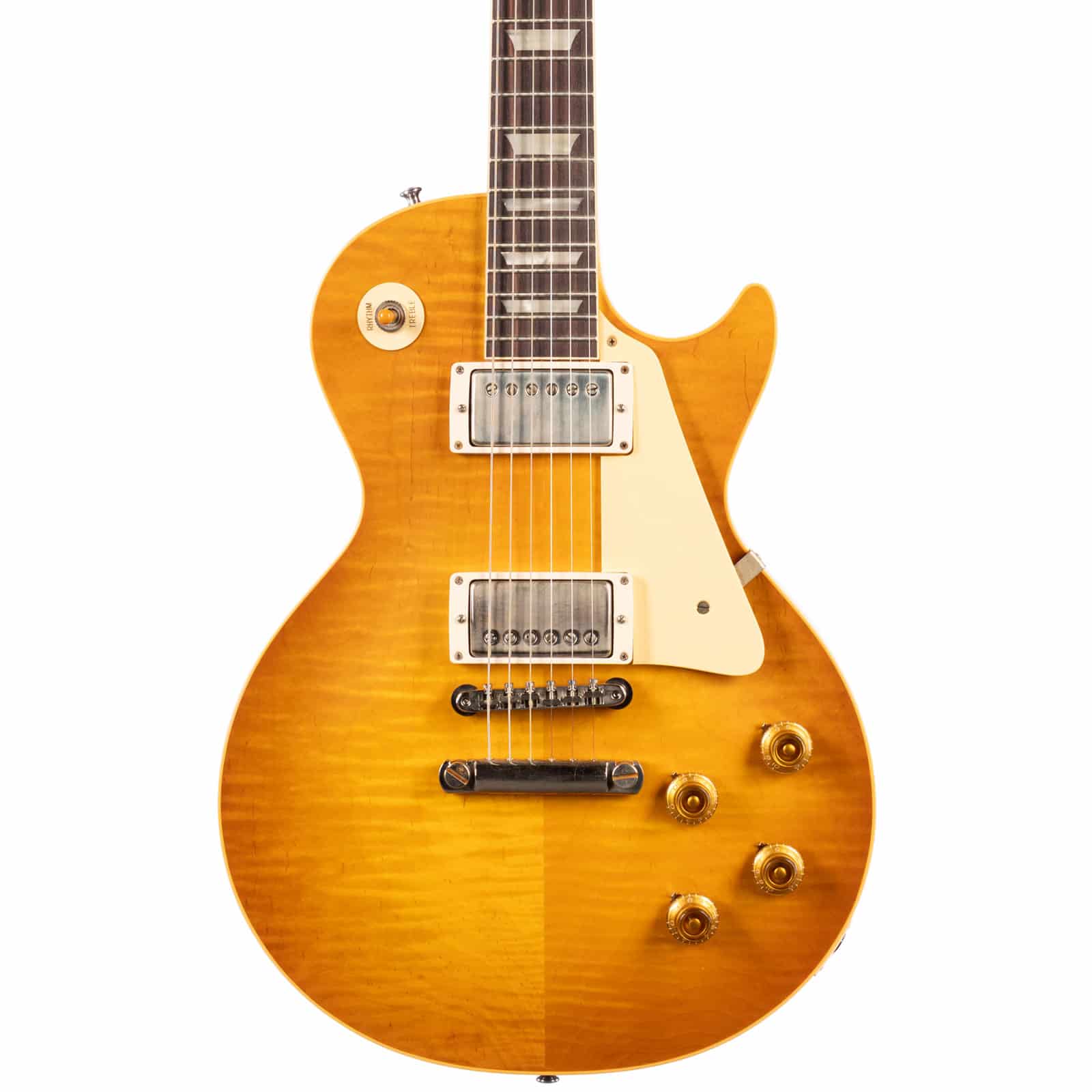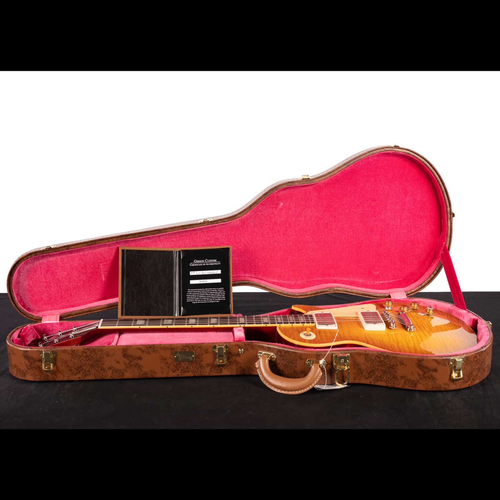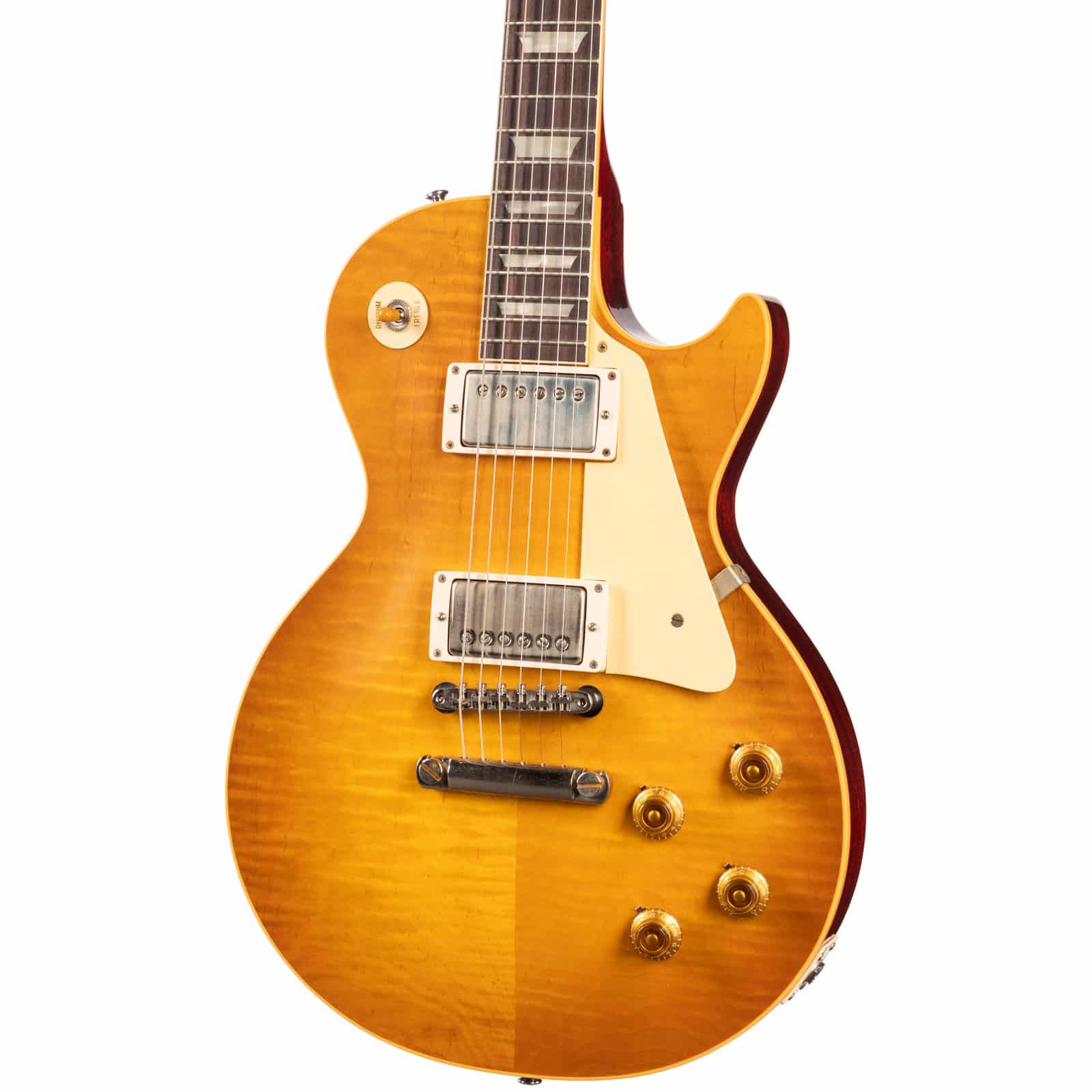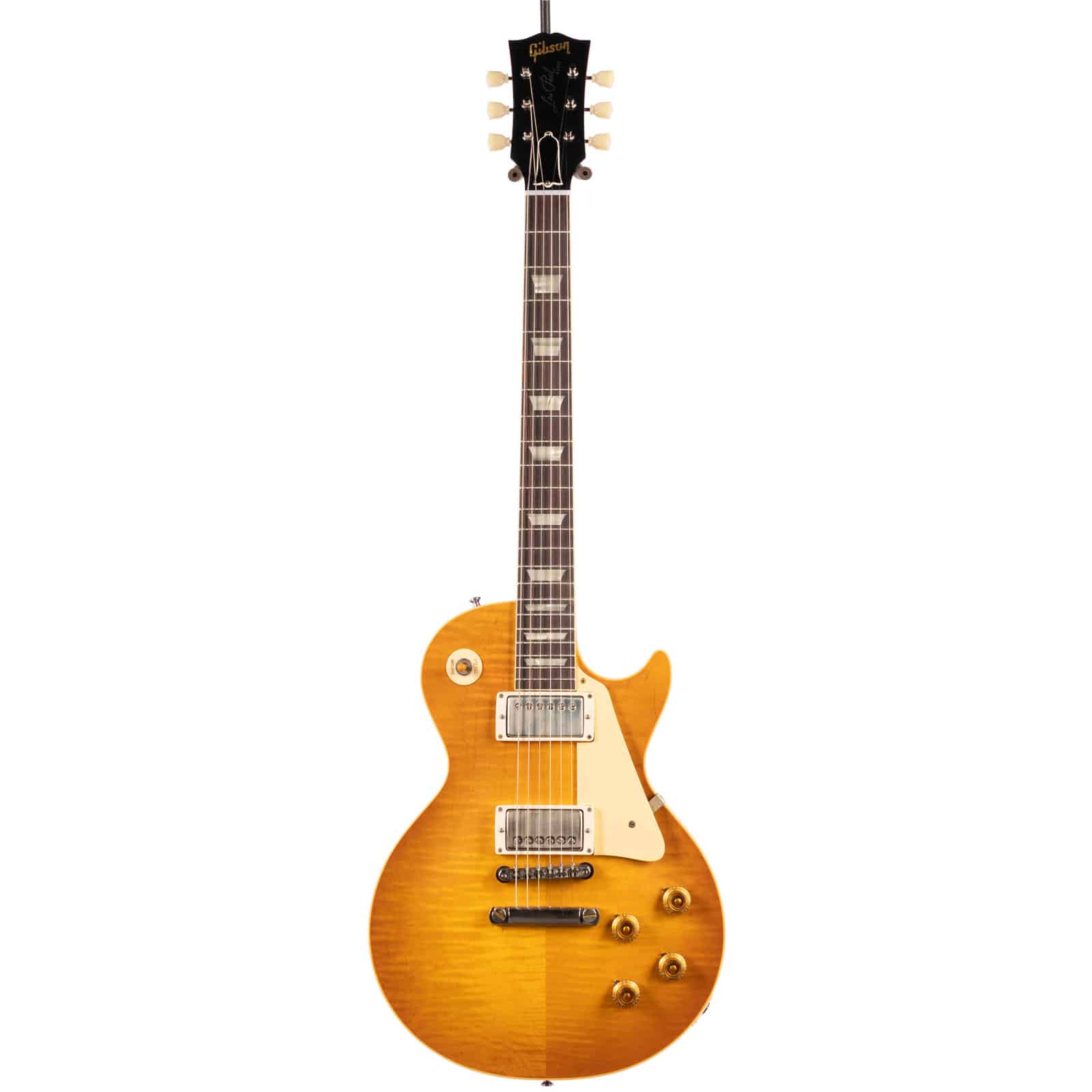 For those who know, there’s nothing quite like a ’59 Les Paul. It’s the benchmark, the icon, the undisputed champion of electric guitar tone. This Gibson Custom Shop 1959 Reissue isn’t just a tribute—it’s a meticulous, note-for-note recreation of the legend. Dressed in a stunning Dirty Lemon finish with a VOS (Vintage Original Spec) patina, this guitar feels like a perfectly preserved piece of history from the moment you open the case. The figured maple top has a gorgeous, subtle flame that moves in the light, and every component has been chosen to deliver an authentic ’59 experience.
