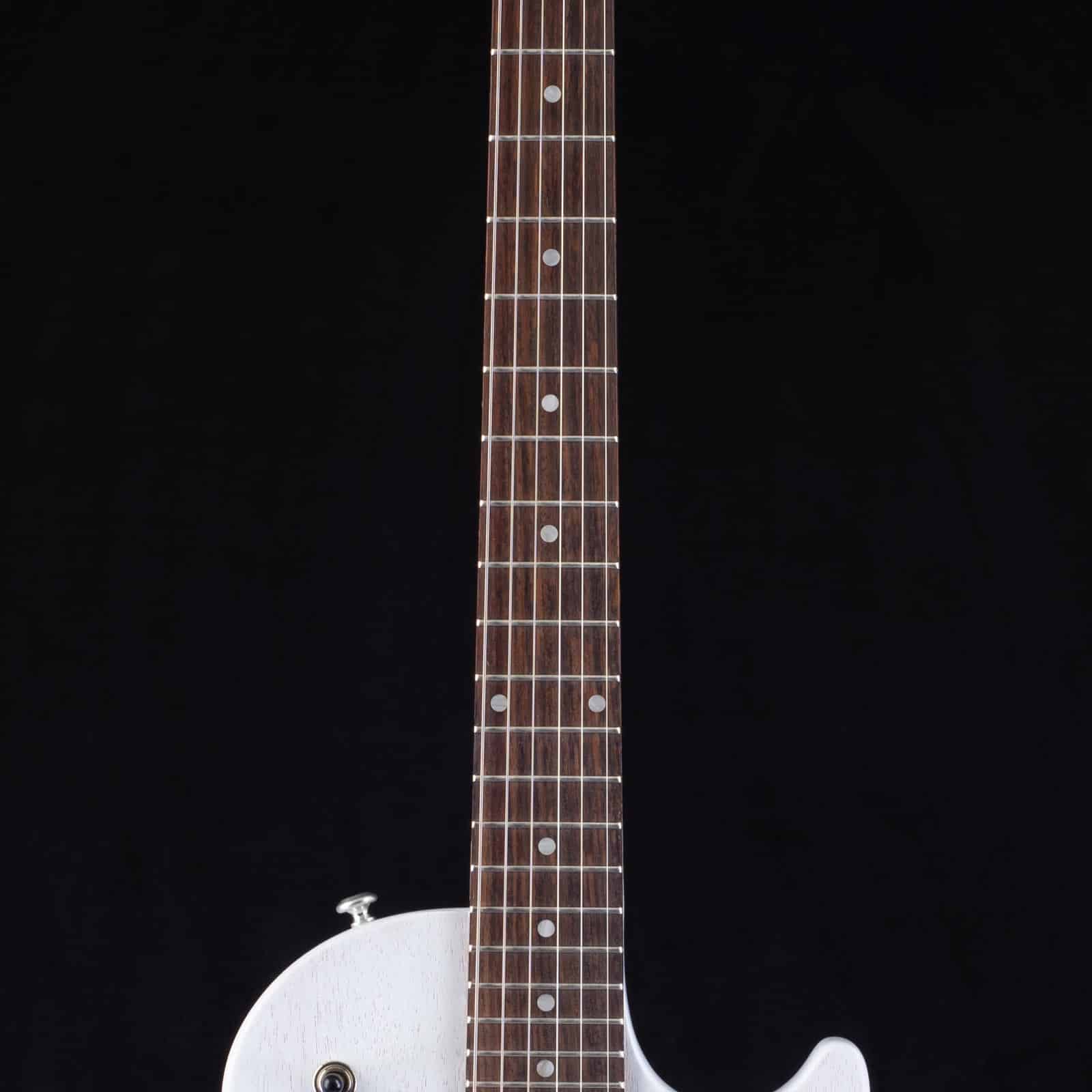 The worn white satin nitrocellulose finish is more than a cool look. Nitro lets the wood breathe and resonate in a way thick poly never will, and the satin feel keeps it slick and fast under stage lights, not sticky. It has that broken in, stage ready vibe right out of the box.