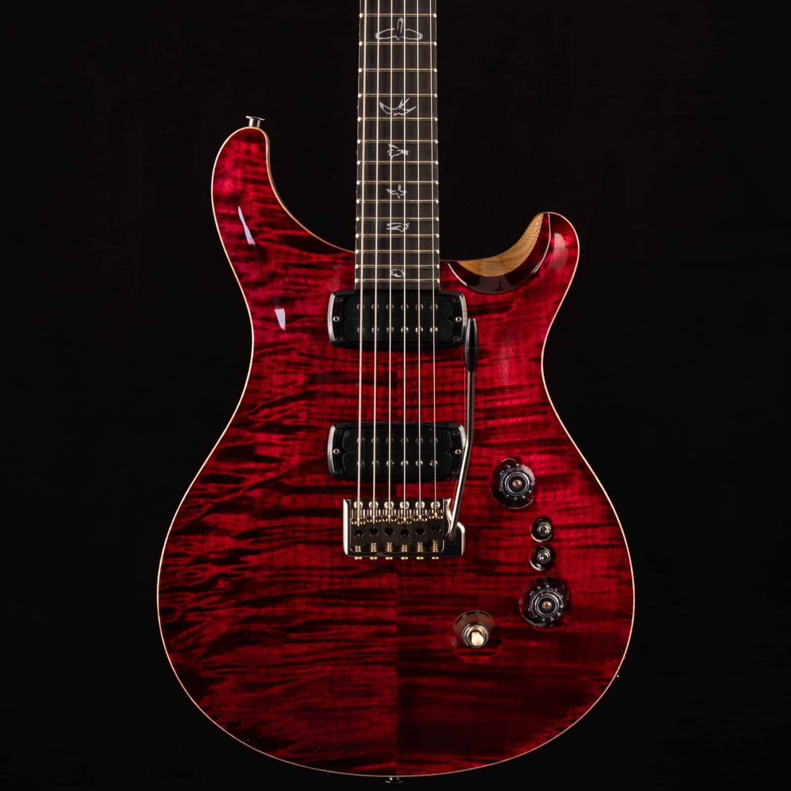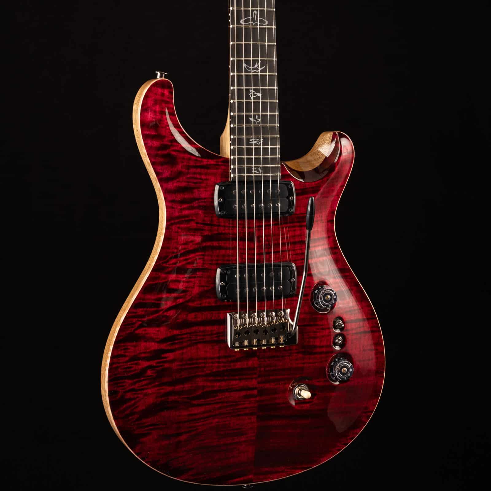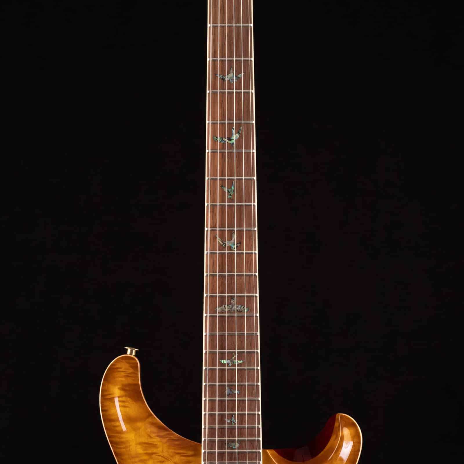The Brazilian rosewood fretboard is a big part of what sets this Wood Library run apart. It has that smooth, glassy feel under your fingers and a fast attack that makes every note feel more alive. The paua bird outline inlays and inlaid signature on the headstock are pure PRS eye candy.