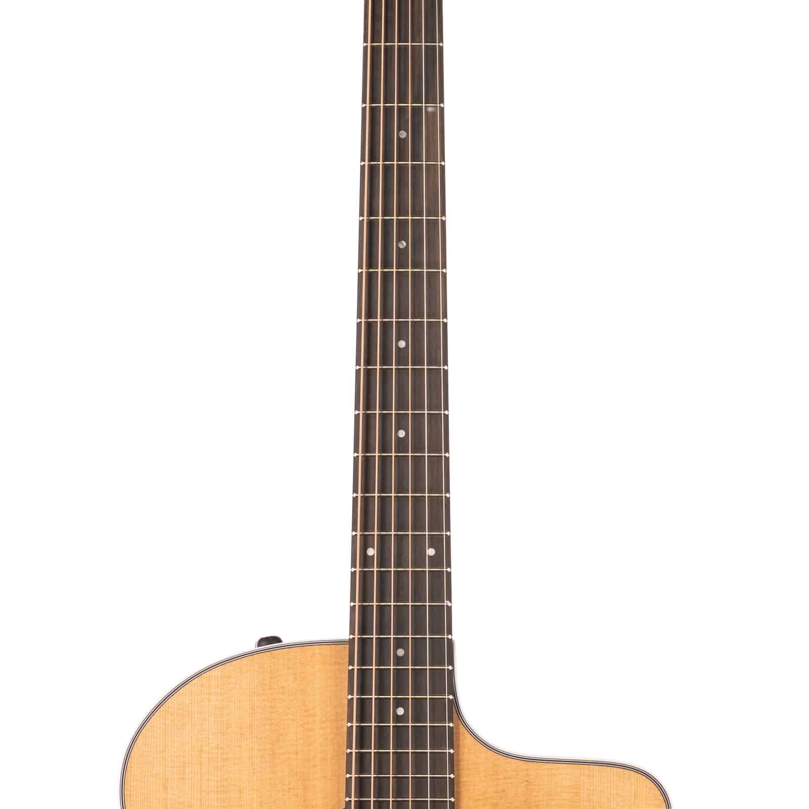 Plug in, and the Taylor Expression System 2 (ES2) electronics deliver a beautifully natural and dynamic amplified tone. The behind-the-saddle pickup design captures the guitar’s true voice, not just the string sound, making it a breeze to dial in a great live sound. The neck is pure Taylor: a comfortable Standard Carve profile on a smooth Neo-Tropical Mahogany neck that feels fast and familiar, encouraging you to play for hours without fatigue.