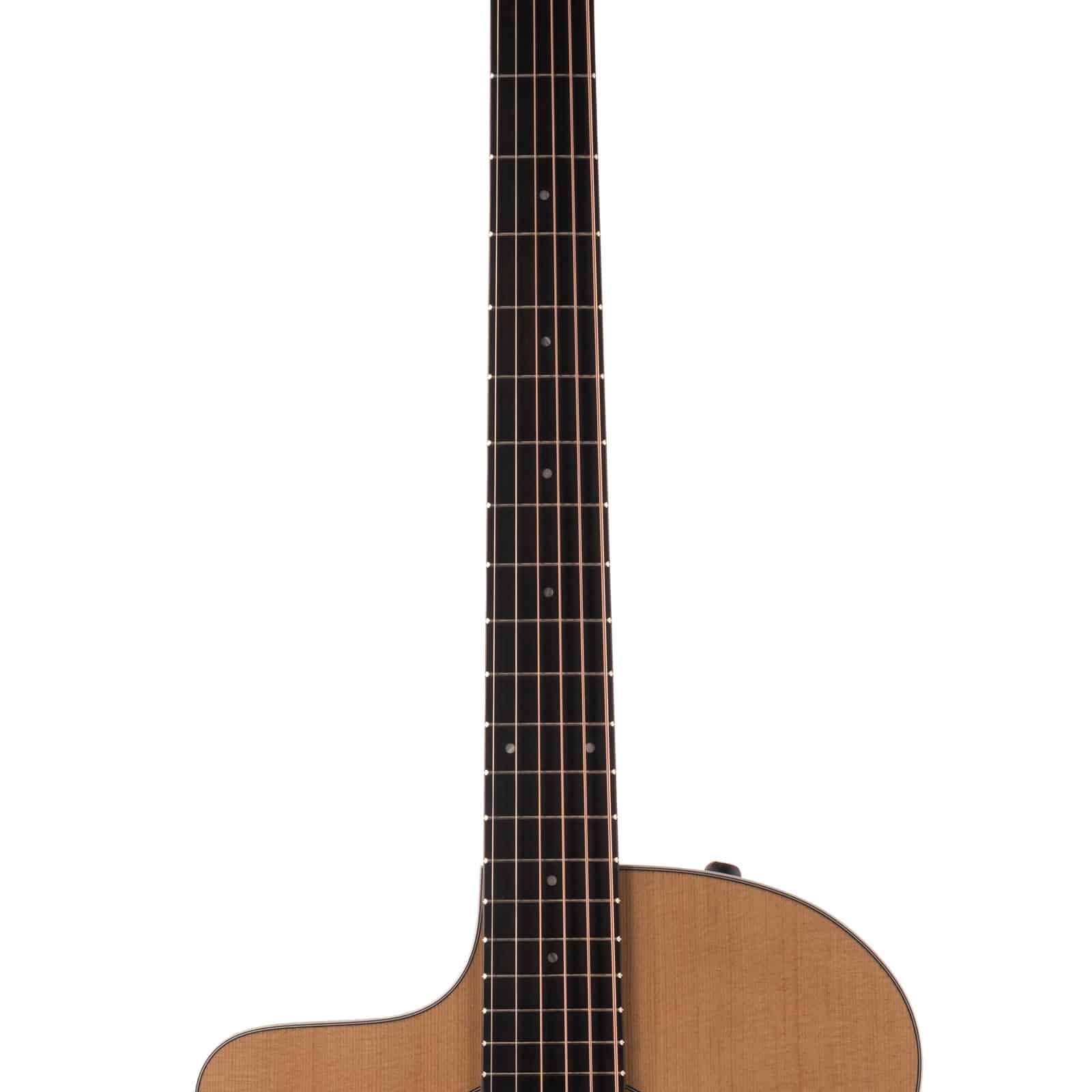 The neo tropical mahogany neck with Taylor’s standard carve feels instantly familiar. It fills your hand enough to feel solid, but it never fights back when you are playing longer sets. The smooth matte finish keeps your hand from sticking, whether you are under hot stage lights or just practicing at home.