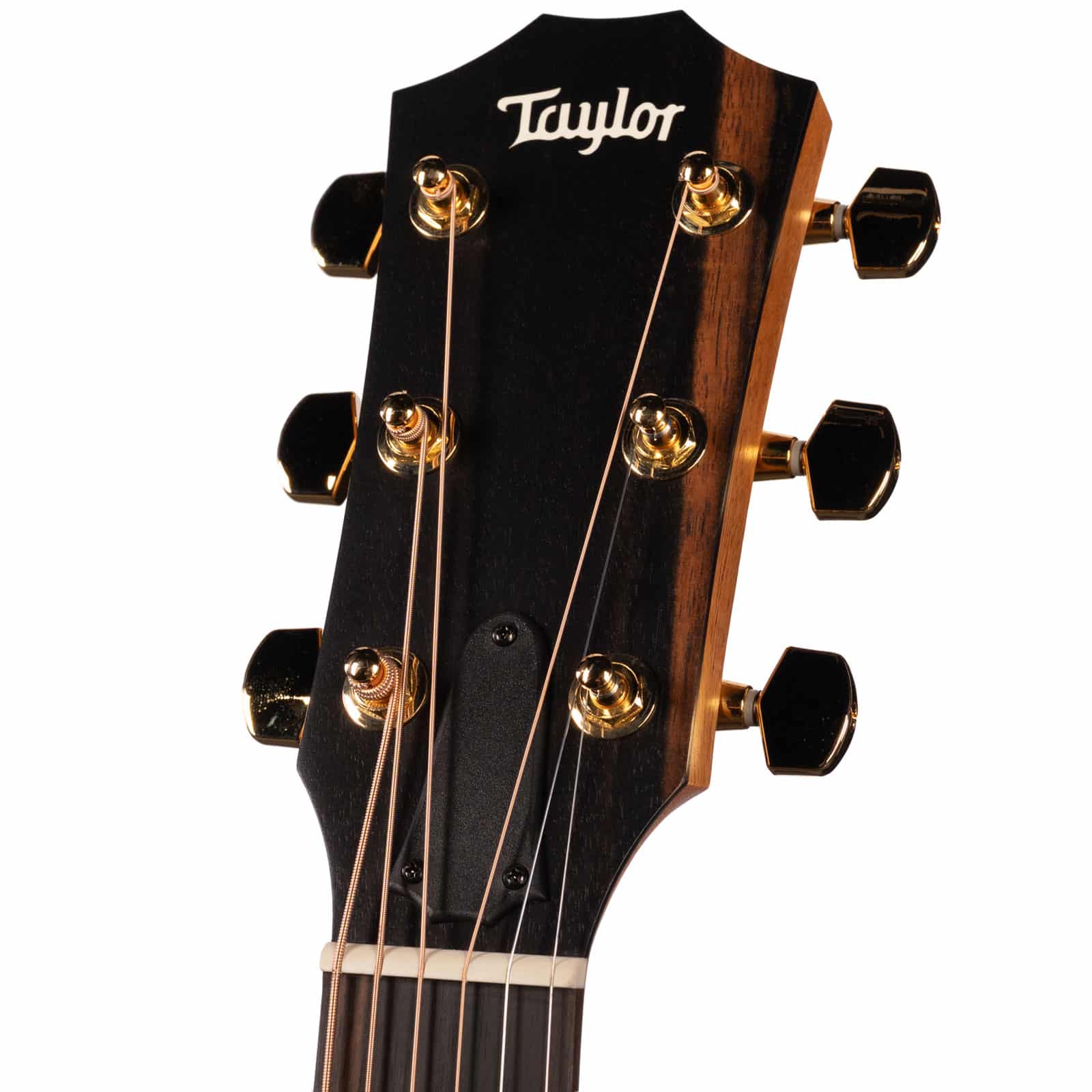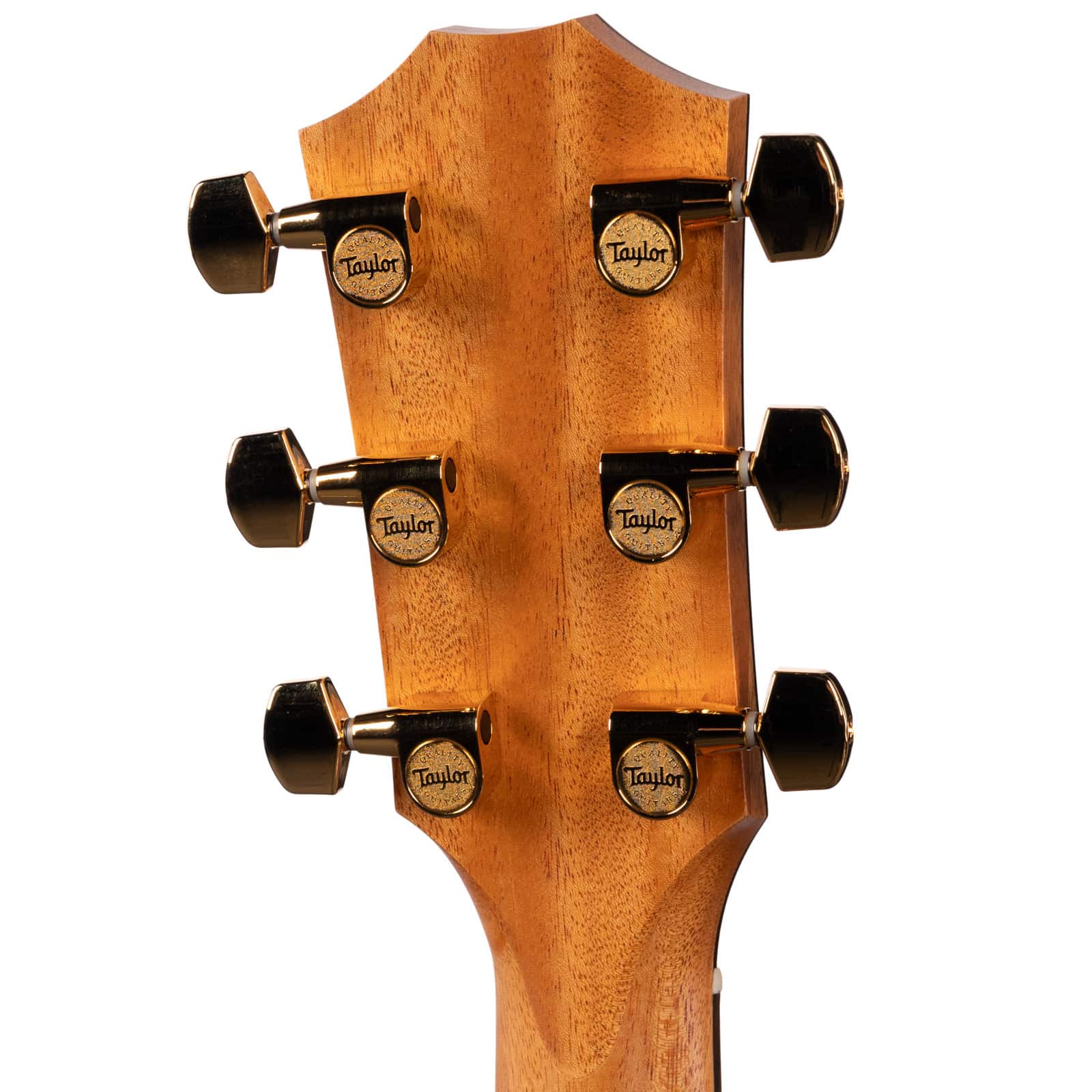 Taylor gold tuners with polished bronze buttons hold tune rock solid. Nubone nut, Micarta saddle, black bridge pins, ebony headstock overlay, and the satin peghead finish all feel premium without being fragile. It ships in a Taylor deluxe brown hardshell case that is ready for the van, the bus, or the overhead bin.
