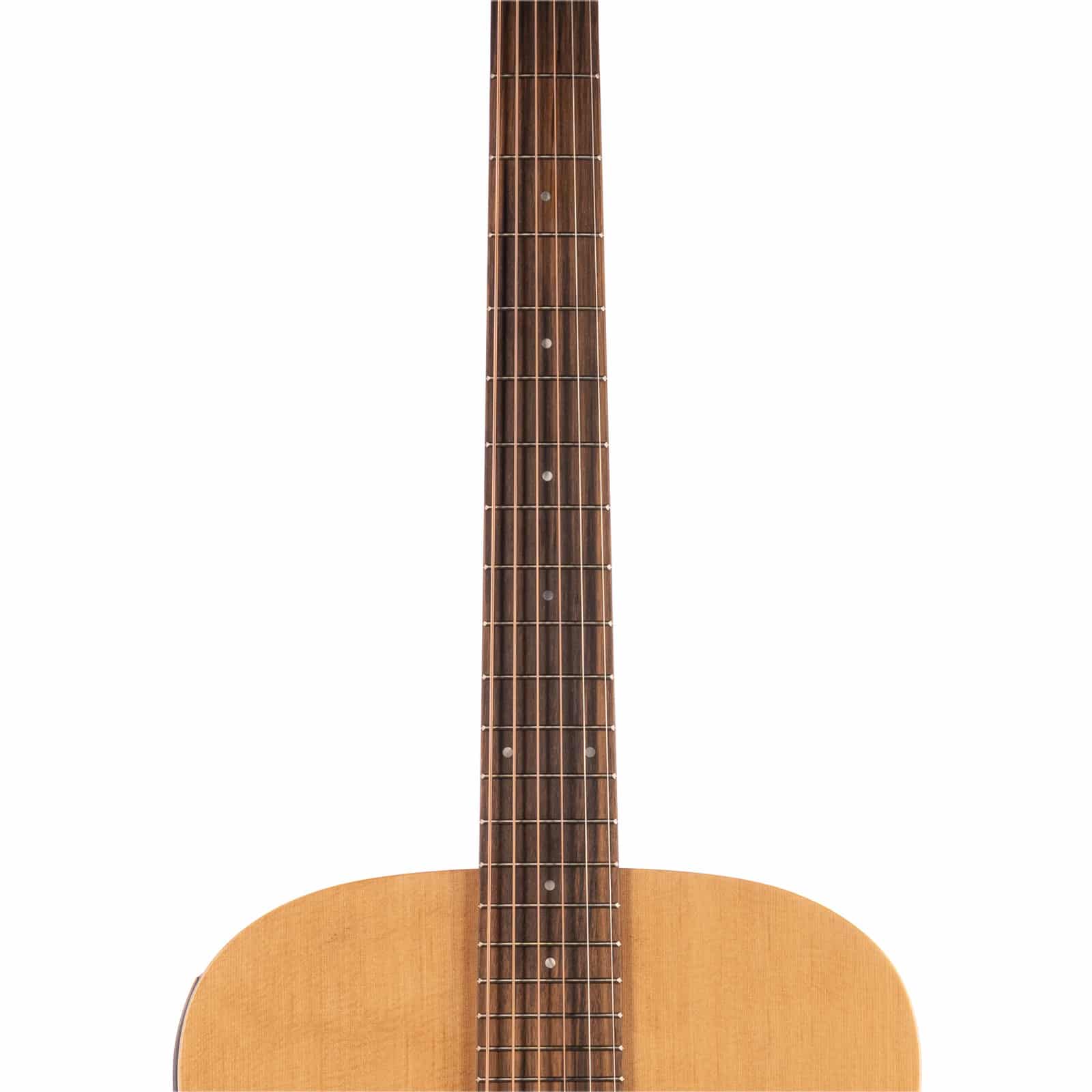 The beveled walnut armrest is a game changer at this price point. It takes the edge off the top so your forearm does not dig into the body, which means less fatigue and longer sessions. Combine that with the shorter 24-7/8 inch scale and light overall weight around 4.4 pounds, and you have an acoustic that just feels friendly under the hands.