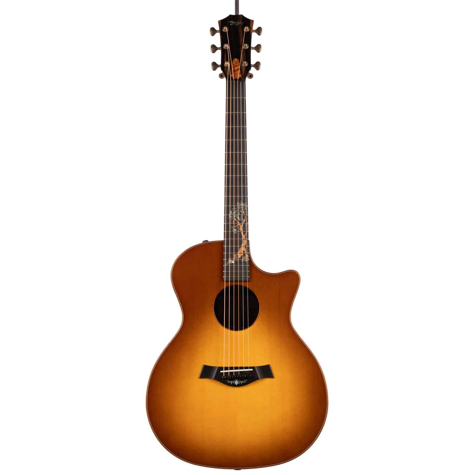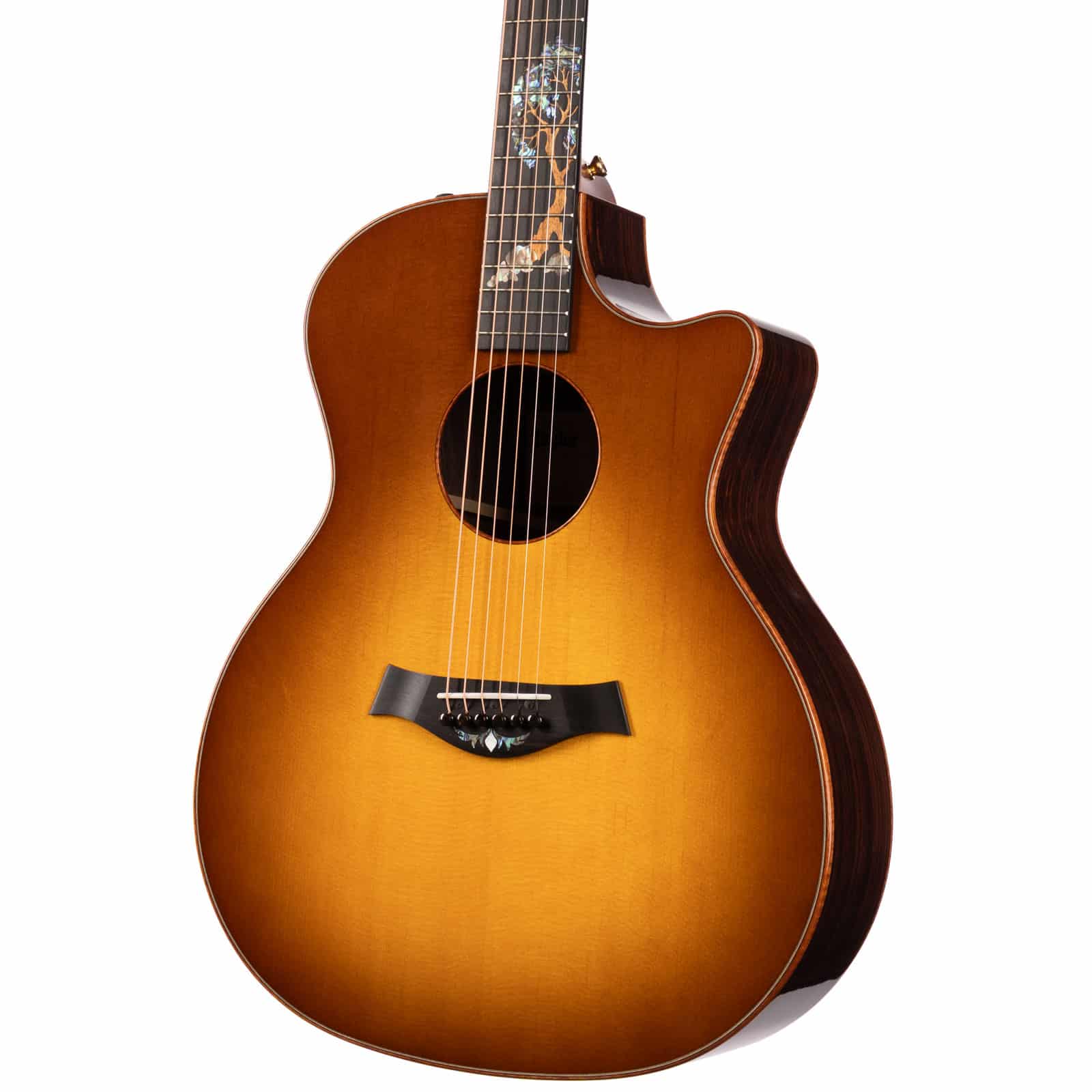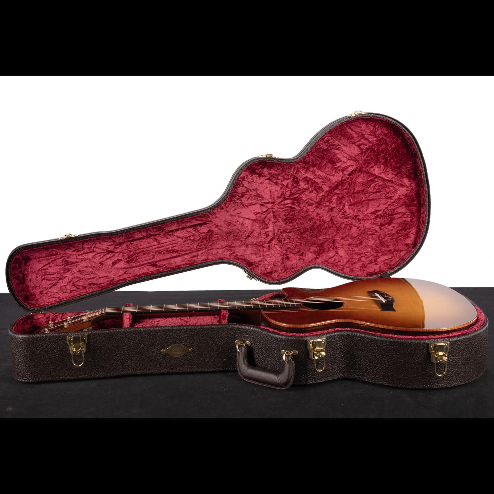 This particular model is a custom Grand Auditorium that features the beloved tonewood pairing of hand-selected Indian rosewood with a Lutz spruce top, producing a versatile sound rich with harmonic texture and blooming overtones. Crafted without a rosette or pickguard to keep the focus on the inlay artistry, this build also sports an ebony peghead veneer with a paua logo, dark-stained bone bridge pins and a vintage-vibed honey sunburst top color treatment to complement its full-body gloss finish. Gotoh 510 tuners in antique gold and ES2 electronics with TaylorSense round out the package. It ships with a brown deluxe hardshell case.