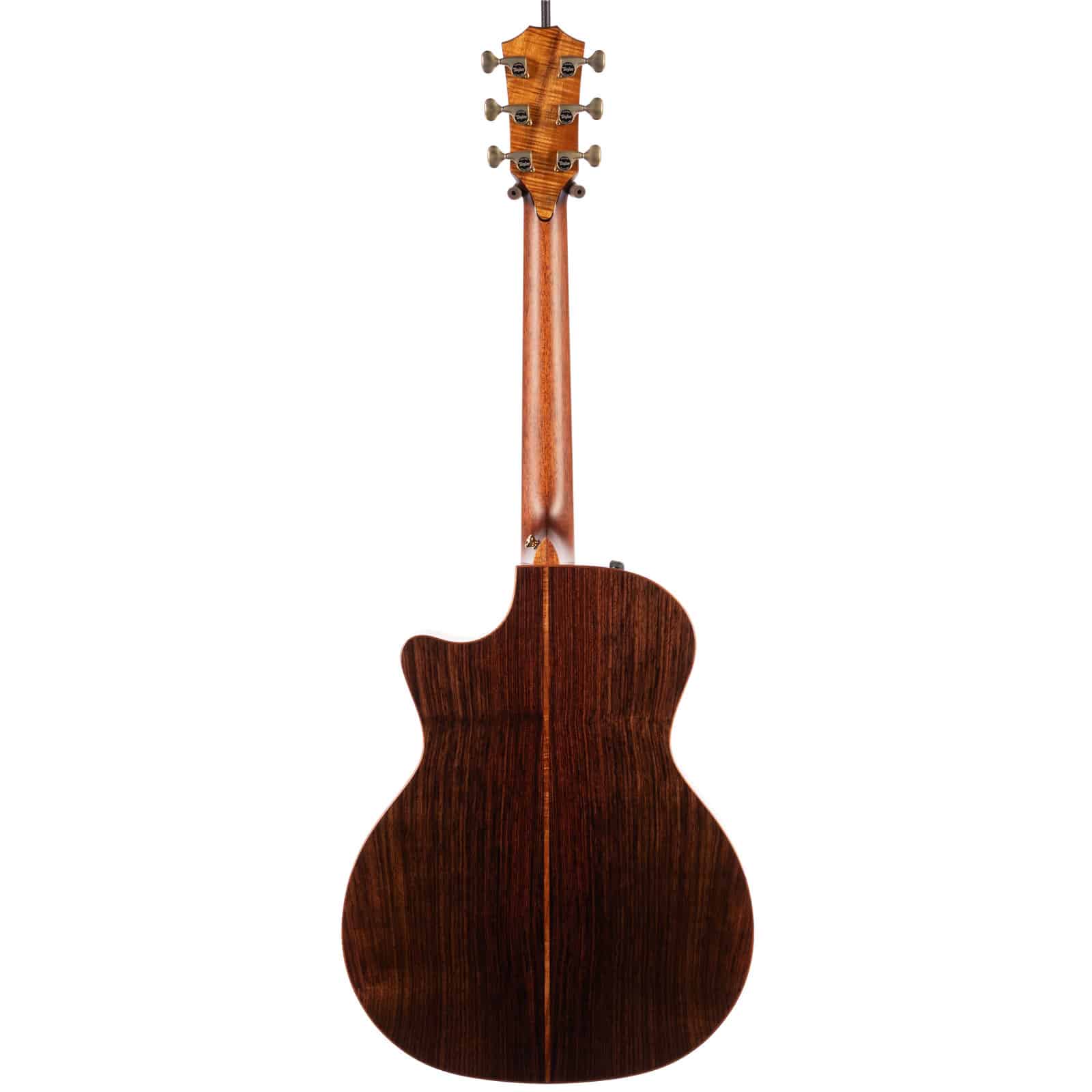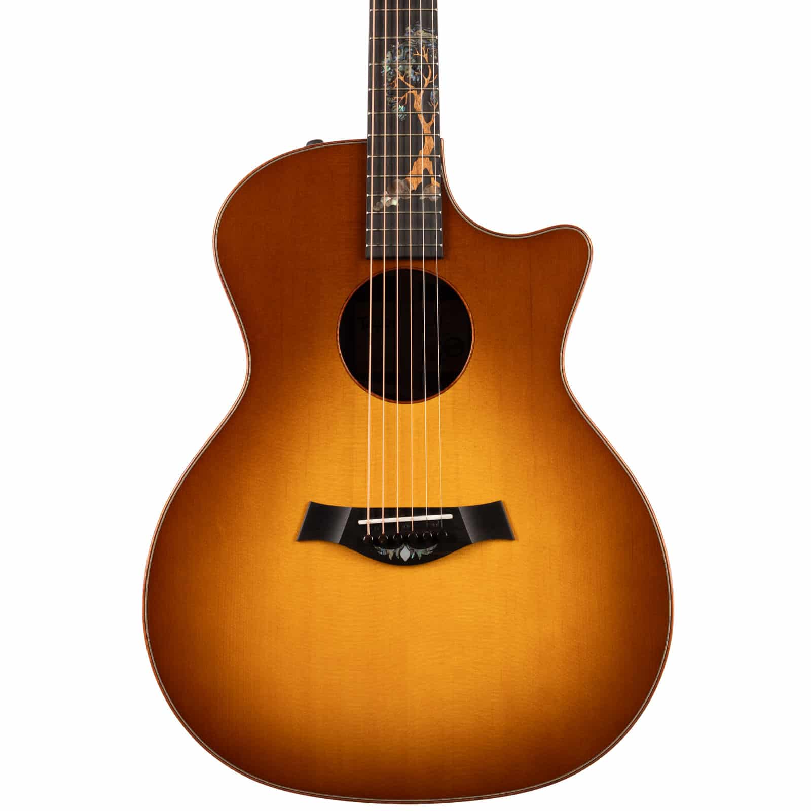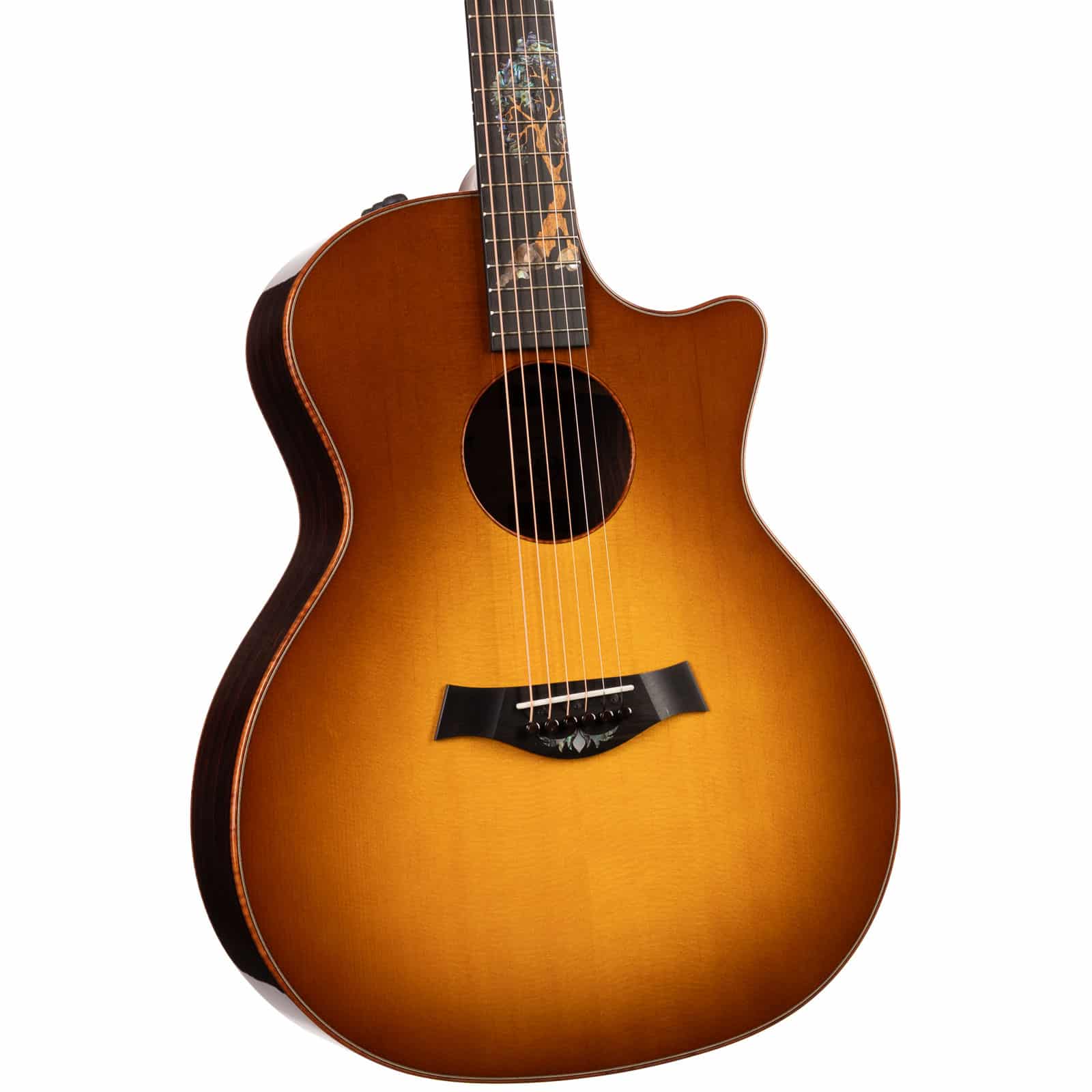 This particular model is a custom Grand Auditorium that features the beloved tonewood pairing of hand-selected Indian rosewood with a Lutz spruce top, producing a versatile sound rich with harmonic texture and blooming overtones. Crafted without a rosette or pickguard to keep the focus on the inlay artistry, this build also sports an ebony peghead veneer with a paua logo, dark-stained bone bridge pins and a vintage-vibed honey sunburst top color treatment to complement its full-body gloss finish. Gotoh 510 tuners in antique gold and ES2 electronics with TaylorSense round out the package. It ships with a brown deluxe hardshell case.