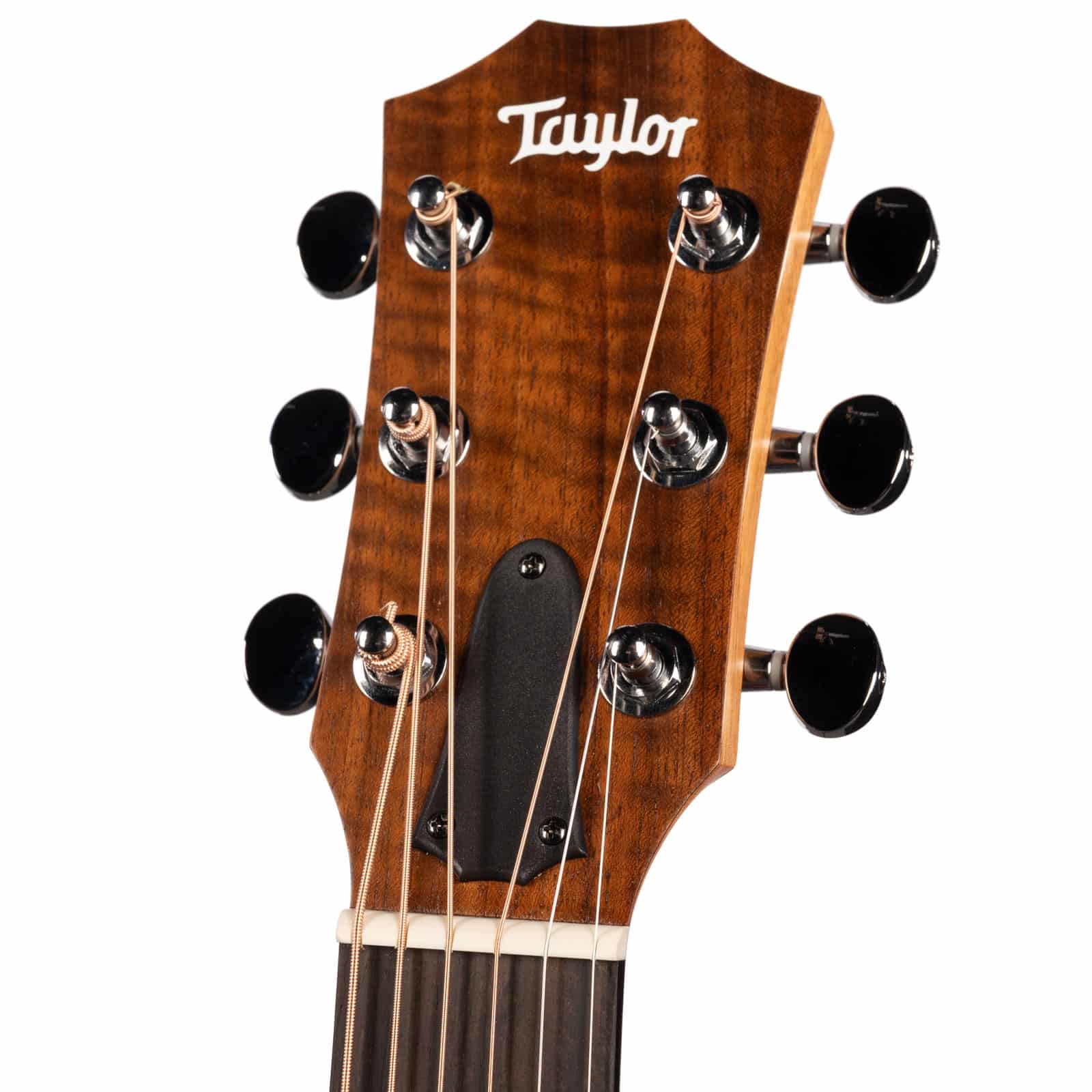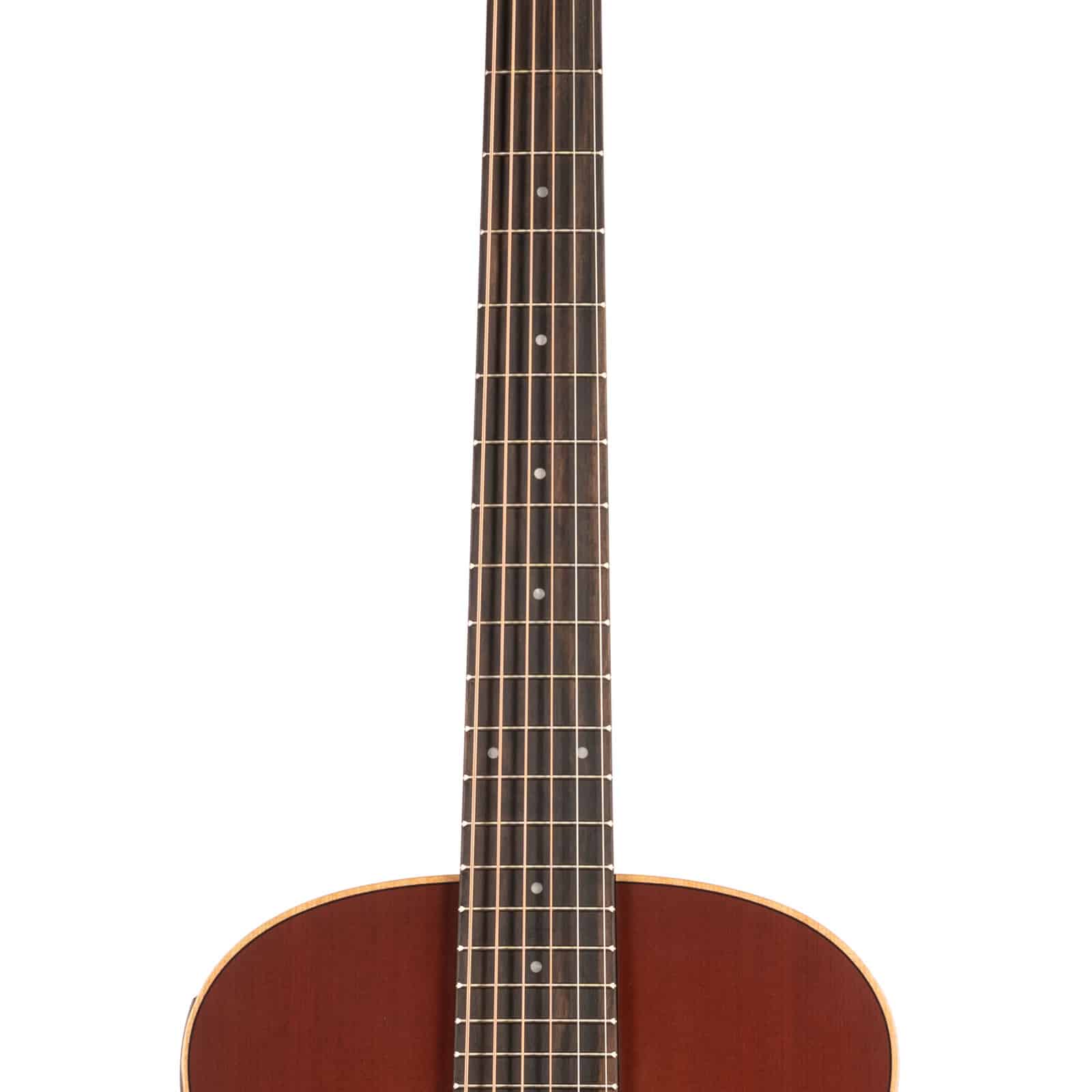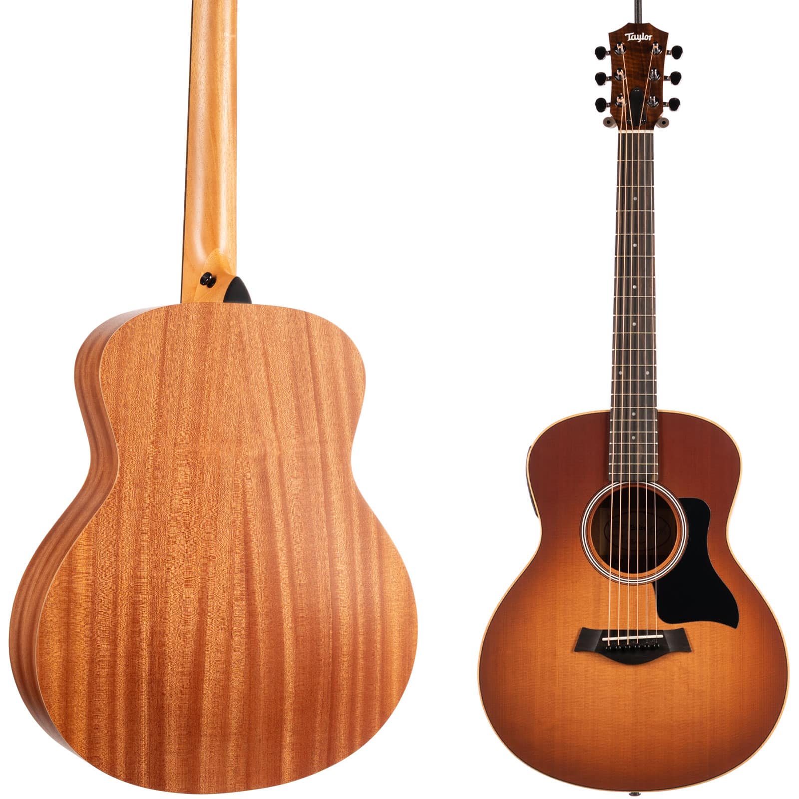 That classic Taylor neck—carved from neo-tropical mahogany—feels instantly familiar and comfortable. With a slightly shorter 23.5″ scale length and a 1-11/16″ nut width, complex chords and buttery-smooth runs feel almost effortless. It’s the kind of guitar you can play for hours without fatigue. And when you’re ready to plug in, the onboard **ES-B electronics** translate its natural acoustic voice with pristine accuracy, and even include a built-in digital tuner for quick adjustments on the fly.